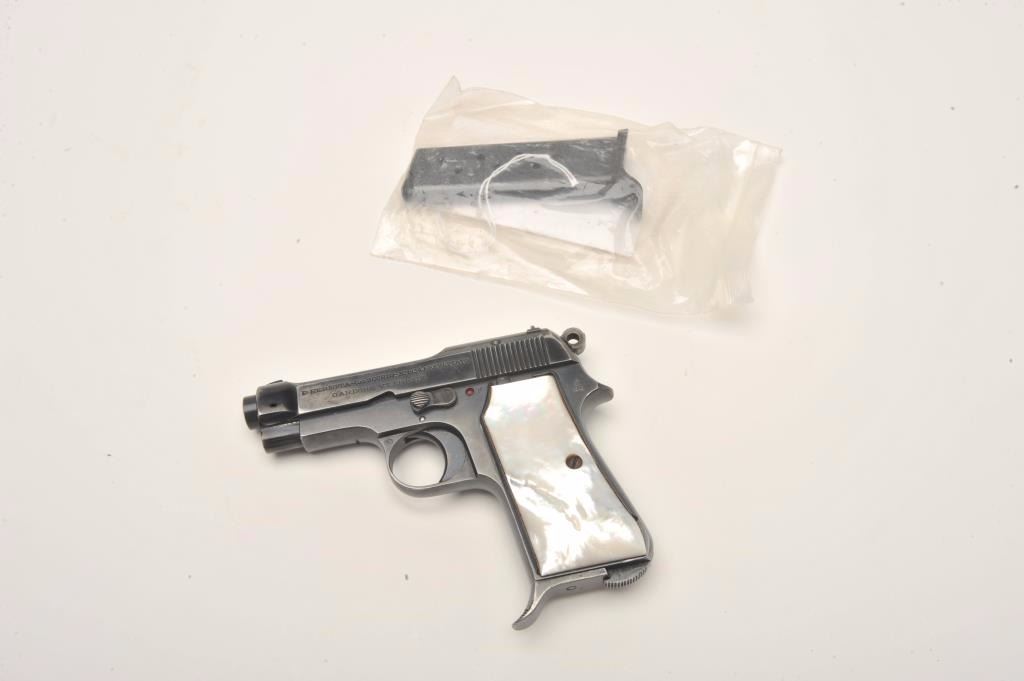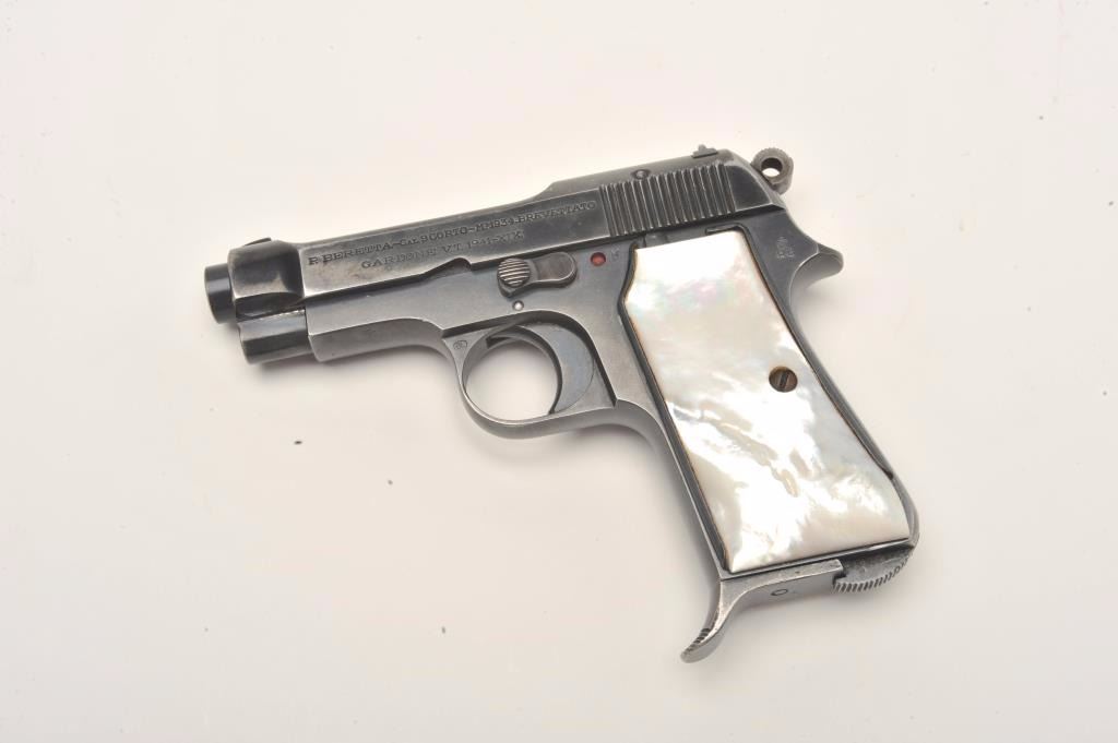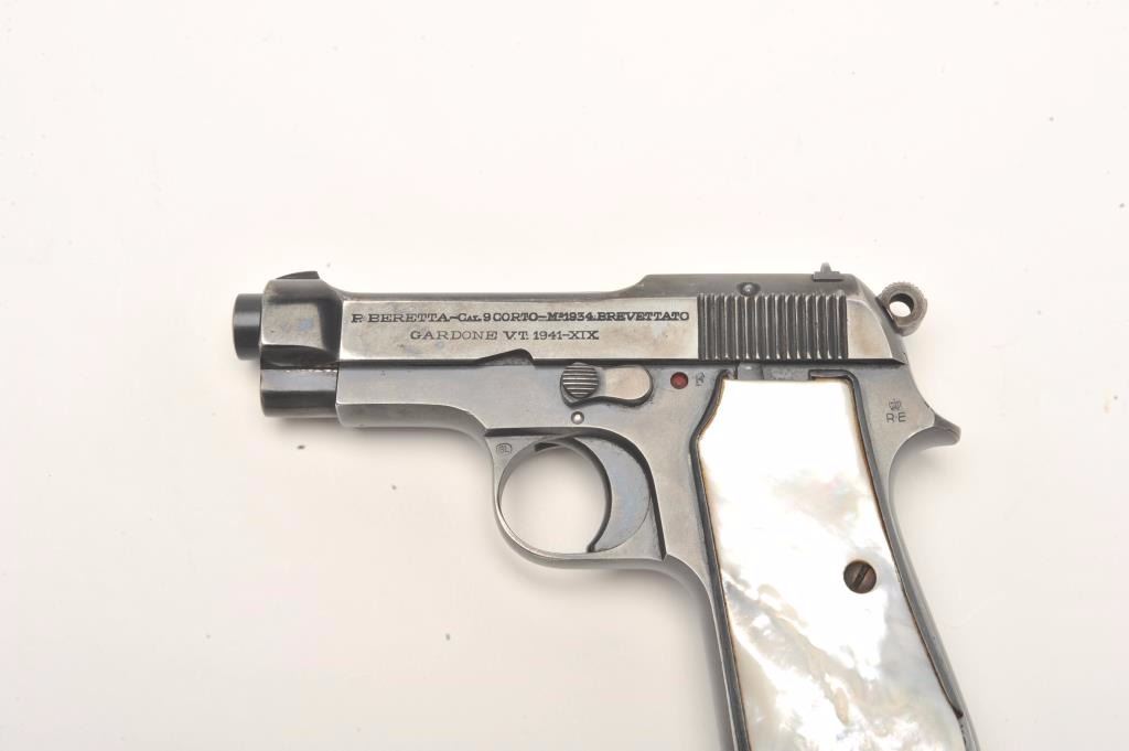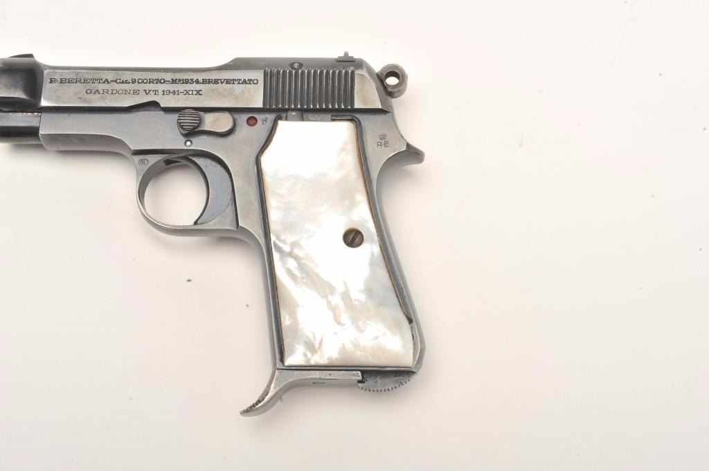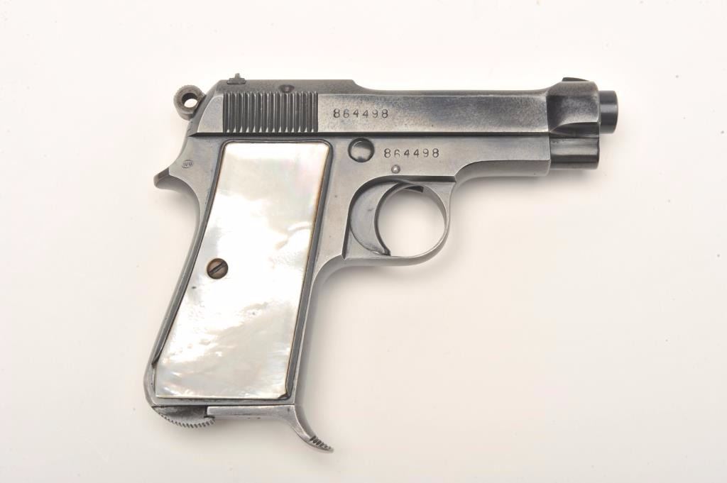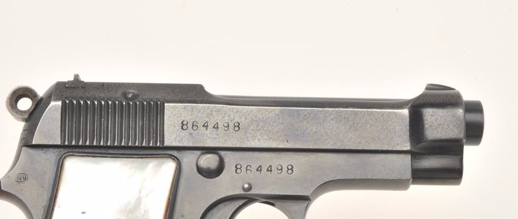Beretta Model 1934 semi-automatic pocket pistol, 9mm caliber, 3.25” barrel, blued finish, pearl grips, one extra magazine, S/N 864498, in overall very good to fine condition showing the majority of itsoriginal blued finish, good bore, crisp action, sharp markings and beautiful iridescent pearl grips. (C&R/No PPT). Est.: $200-$400.