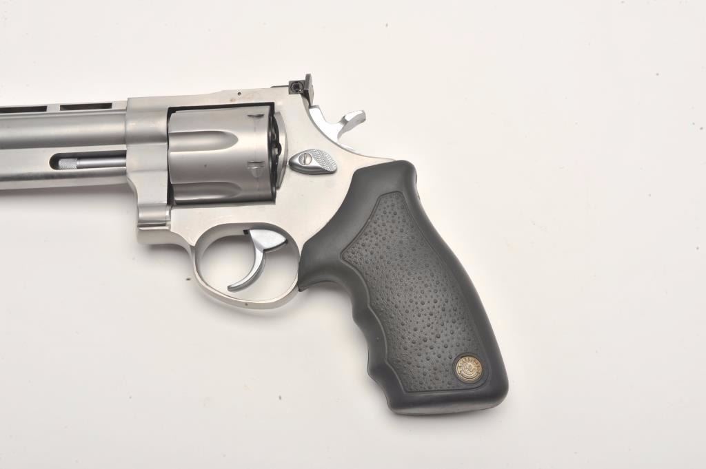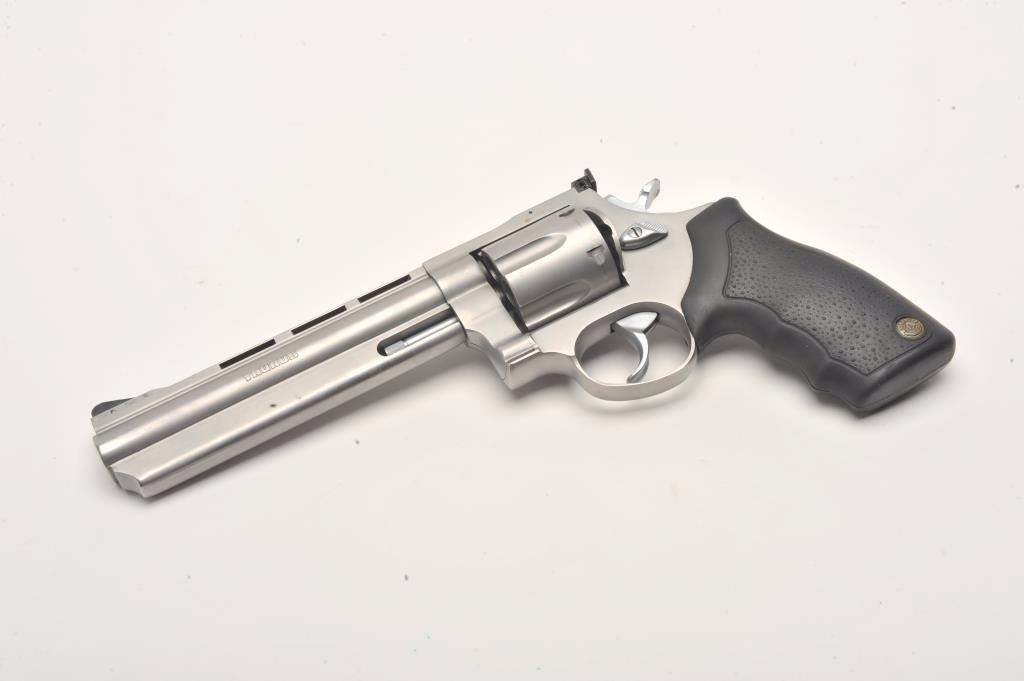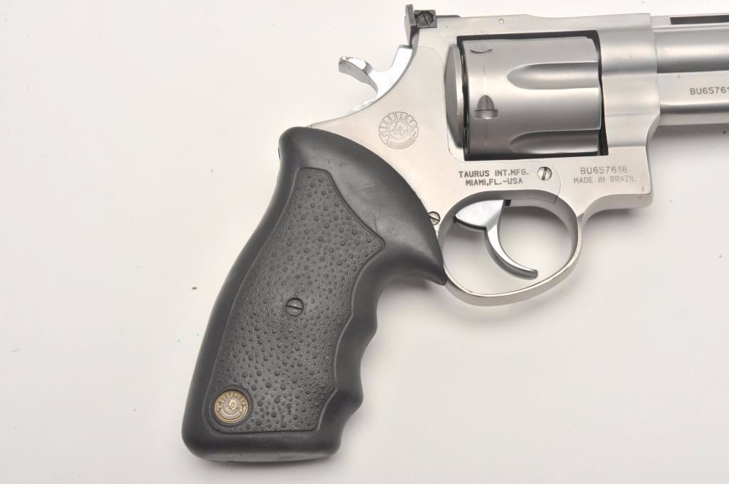 Taurus DA revolver, .44 Magnum caliber, 6.5” ventilated rib and ported barrel, satin finish, stippled rubber factory grips, S/N BU657618, in overall fine condition with a fine bore, crisp action, sharp markings andfine grips. (Modern/No PPT/NO CALIF. SALE). Est.: $250-$500.