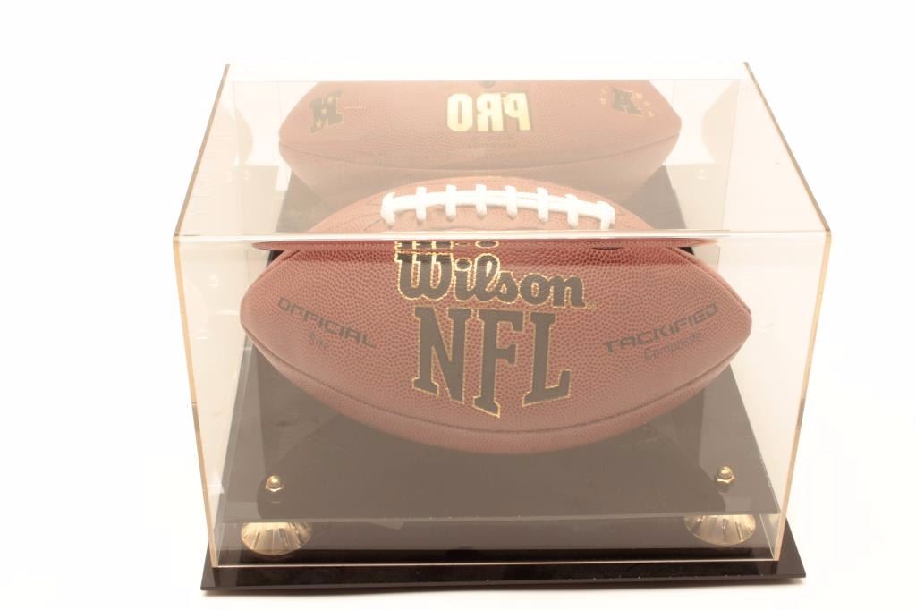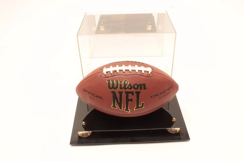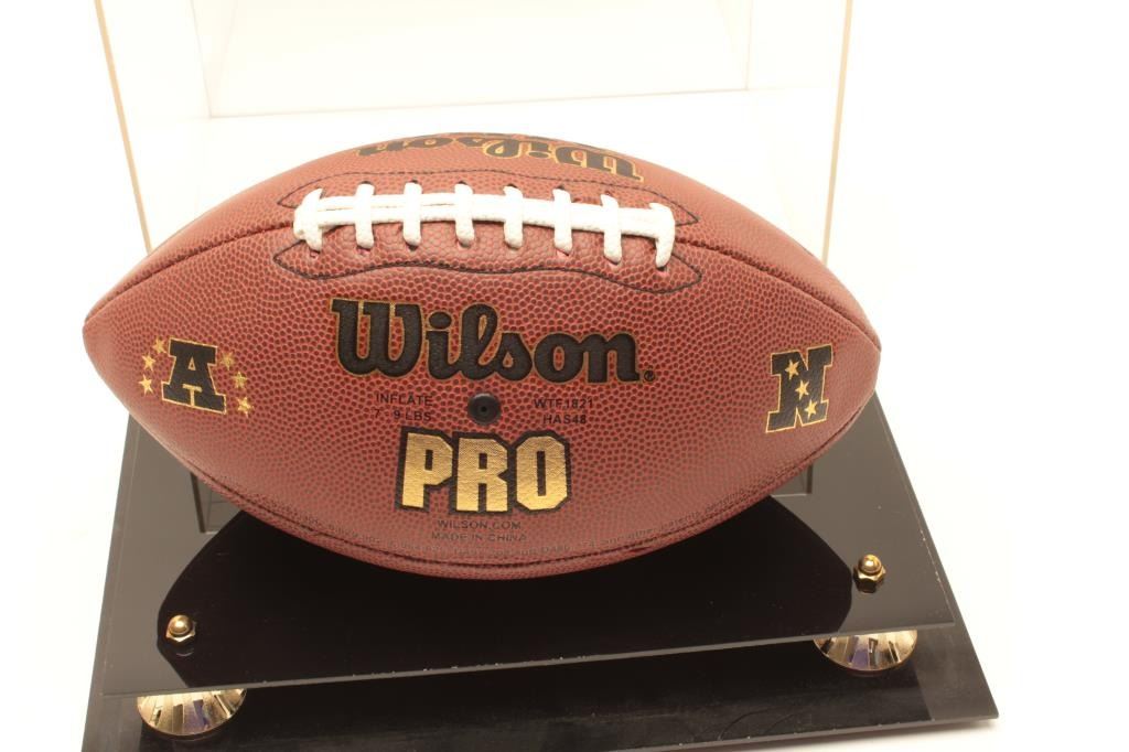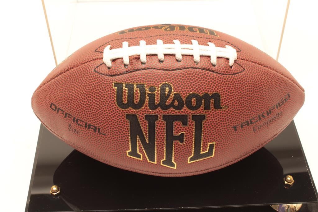 Wilson Official NFL football autographed by former Los Angeles Rams quarterback Jim Everett. The autograph reads, “GOD BLESS! Jim Everett RAMS”. The football is in a plastic display case. Est.: $50-$100.