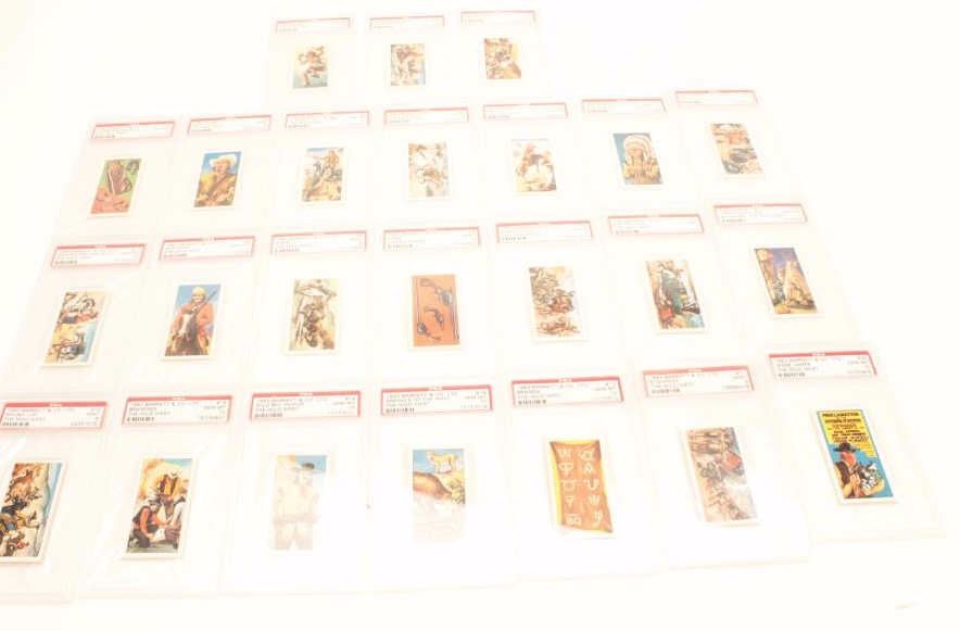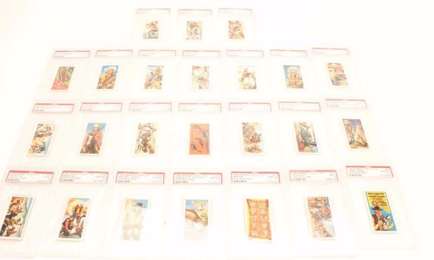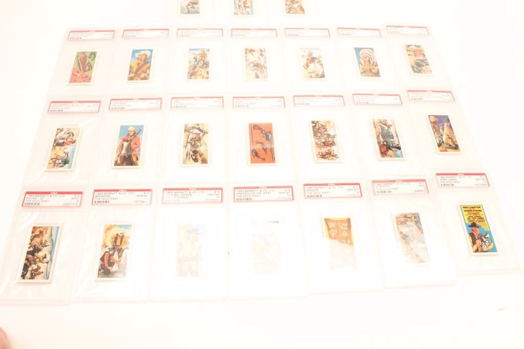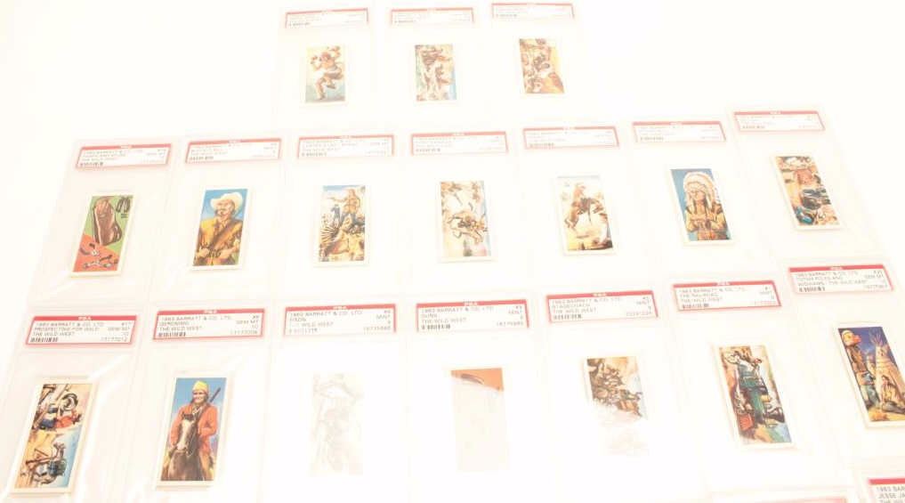 Lot of 1963 Barratt & Co. LTD. London, England Tobacco cards. The lot includes 24 graded cards titled The Wild West. The lot is missing only one of the set. Manufactured in 1963 these English tobacco cards areinteresting and collectible all in hard plastic cases marked, PA Sports, Professional Authenticators with the number in the series and grade in the top left corner. Est.: $150-$300.