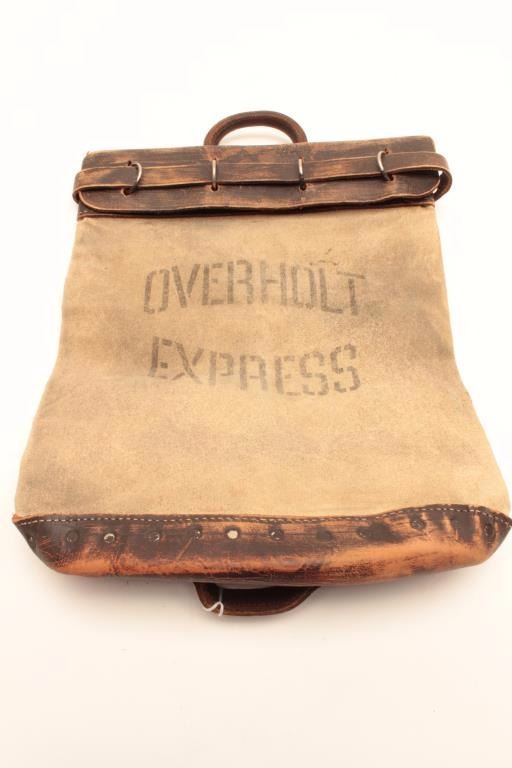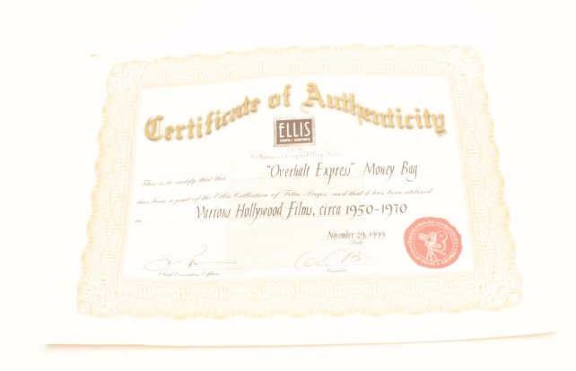 Canvas and leather money bag prop marked “OVERHOLT EXPRESS”, with Certificate of Authenticity from Ellis Props & Graphics indicating this bag was used in various Hollywood films, circa 1950-1970. Est.:$100-$200.