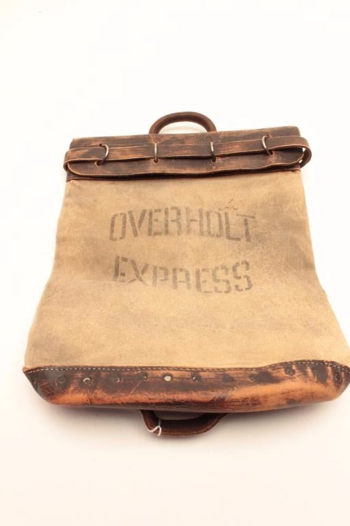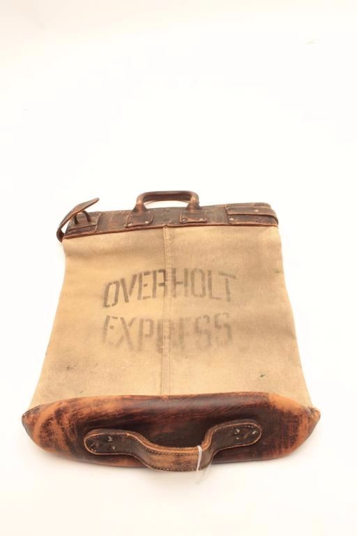 Lot 1222 Canvas and leather money bag prop marked “OVERHOLT EXPRESS”, with Certificate of Authenticity from