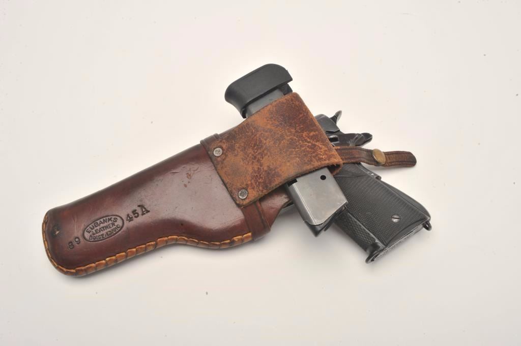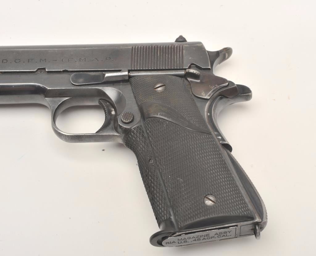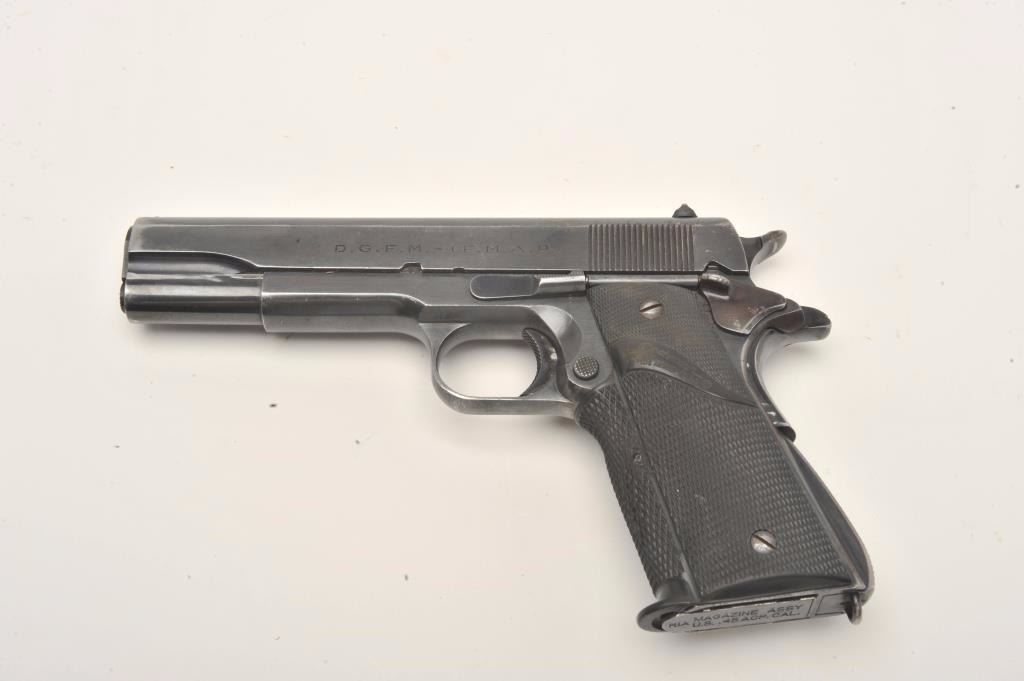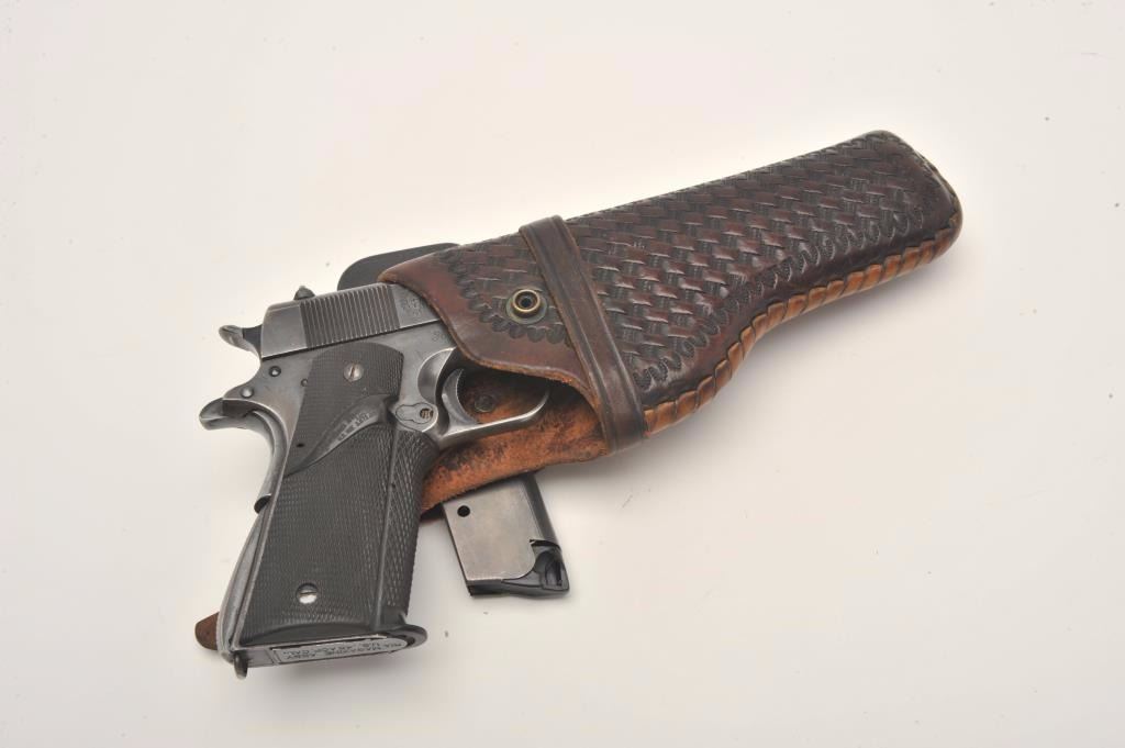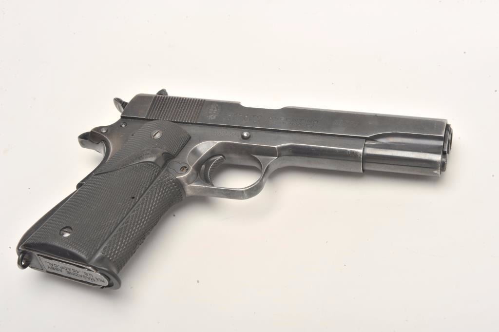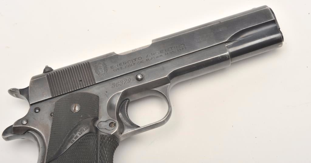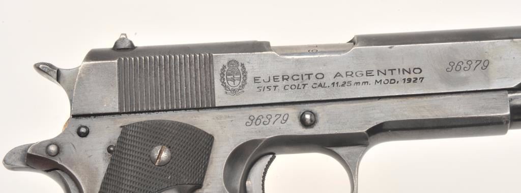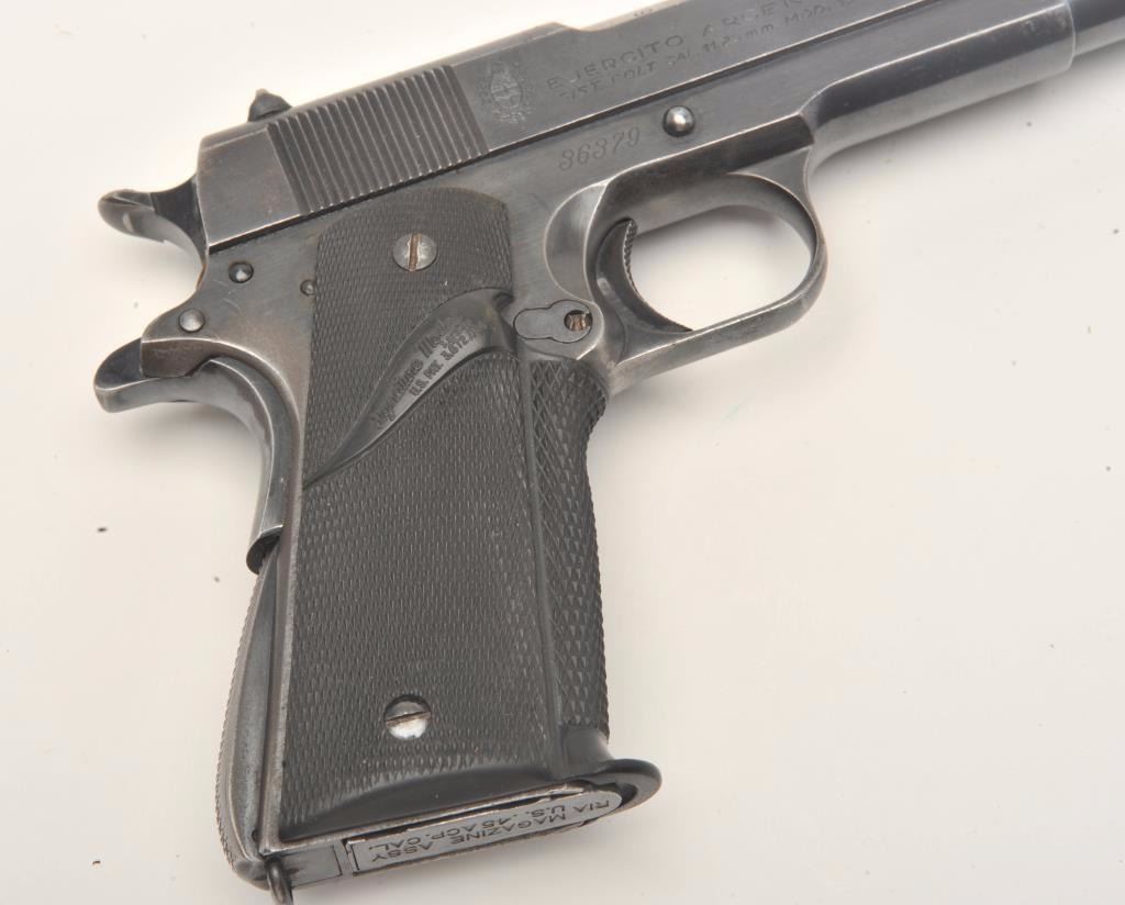 Ejercito Argentino Model 1927 semi-automatic pistol, 11.25mm caliber, 5” barrel, blued finish, checkered rubber Pachmayr grips, S/N 36379 (all matching visible numbers), in overall very good condition showing themajority of blued finish, very good bore, crisp action, sharp markings and very good grips; magazine is marked “MAGAZINE ASSY U.S. .45 ACP CAL./R.I.A.”; with one extra KRD magazine and a leather basket weave holster. (C&R/No PPT). Est.: $250-$500.