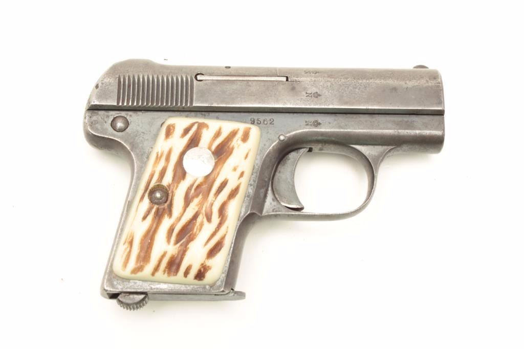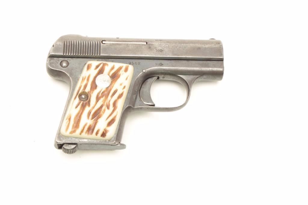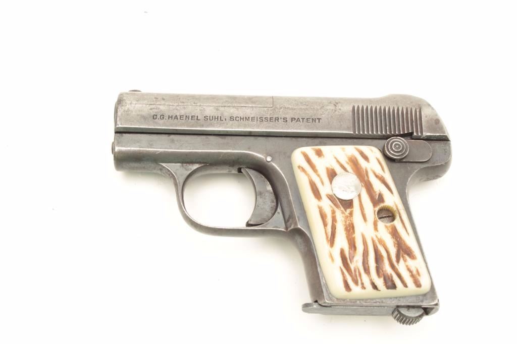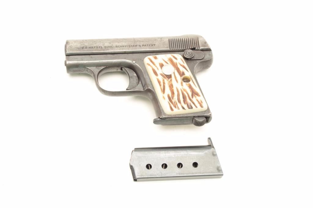 Lot 1229 C. G. Haenel pocket semi-automatic pistol, .25 caliber, 2” barrel, blued finish, faux stag medalli