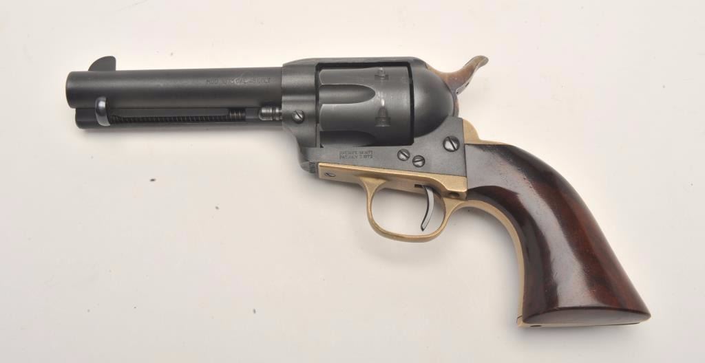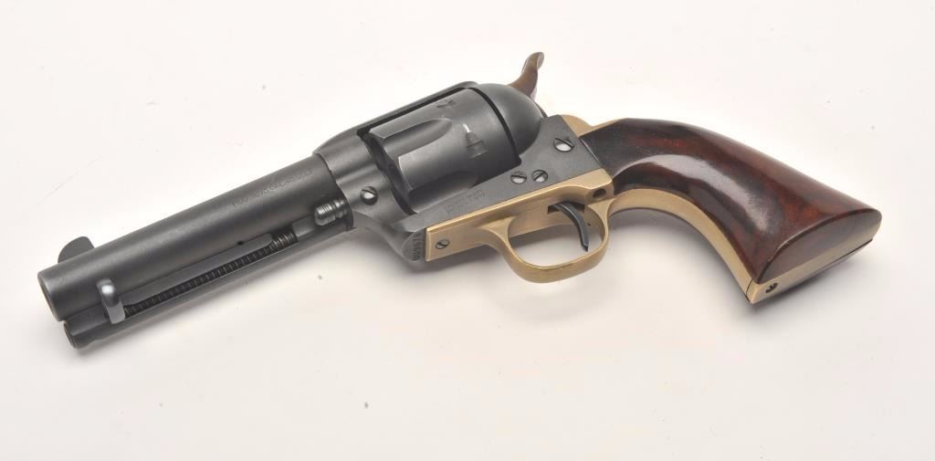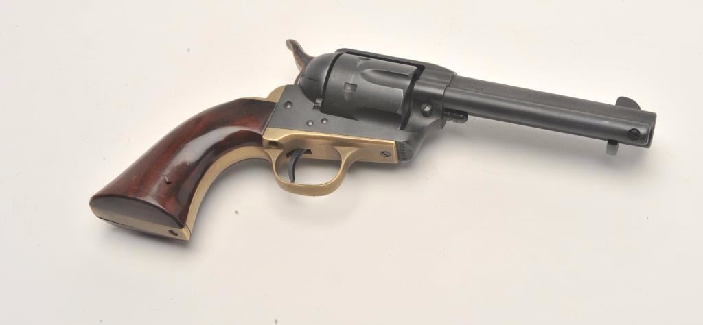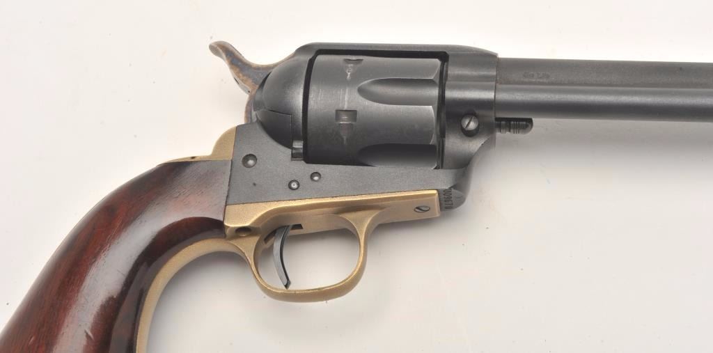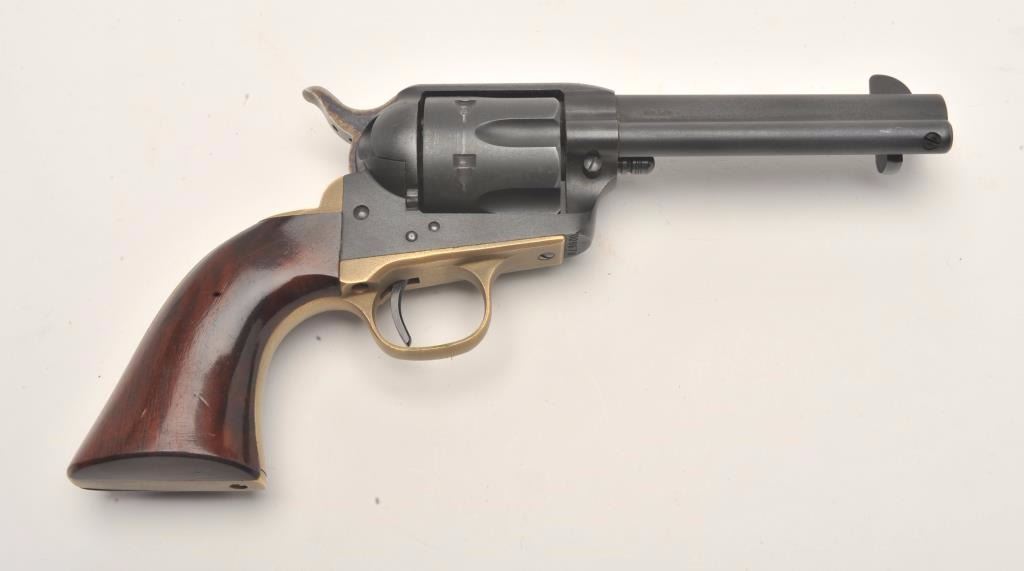 Uberti copy of a Colt SAA revolver, .45 Colt caliber, 4.75” barrel, mat black finish, brass straps, wood grips, S/N U09678, in overall very good to fine condition showing majority of mat finish, fine bore, action,markings and grips. (Modern/No PPT). Est.: $150-$300.