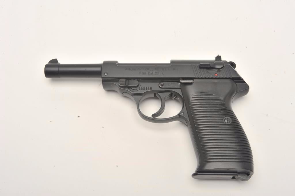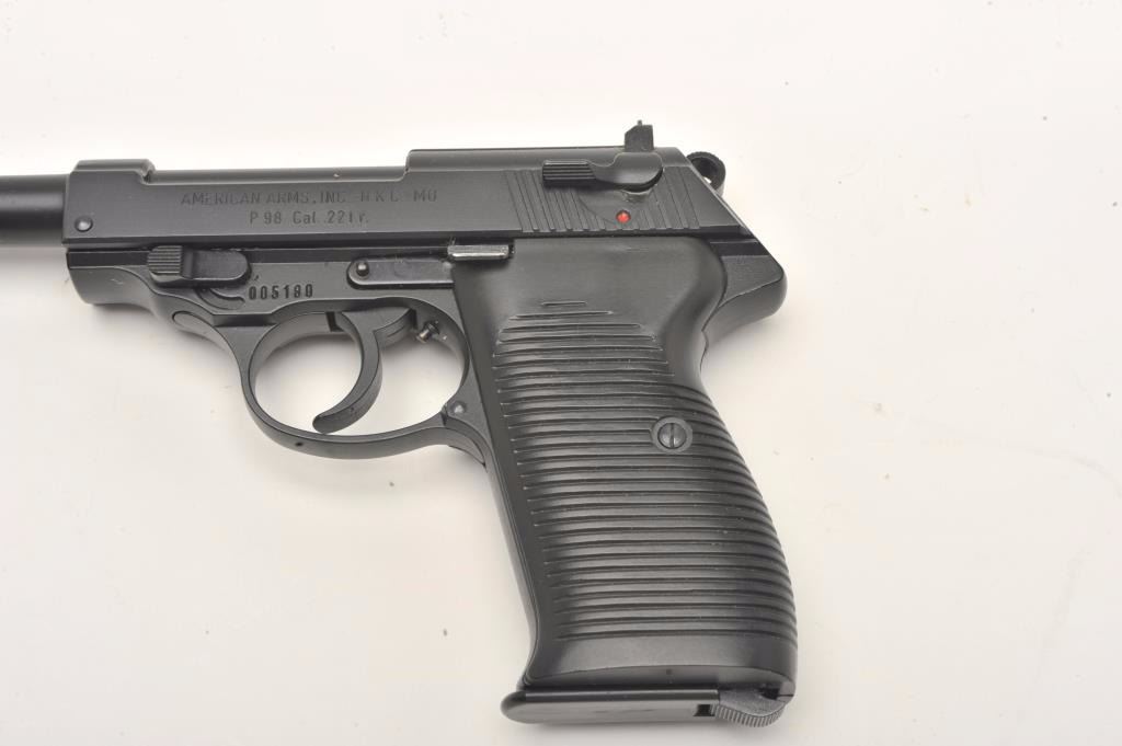 American Arms Model P 98 semi-automatic pistol, .22LR caliber, 5” barrel, black finish, plastic grips, S/N 005180, with factory cardboard box, one extra magazine and instructions; in overall like new condition. (Modern/No PPT/NO CALIF. SALE). Est.: $150-$300.