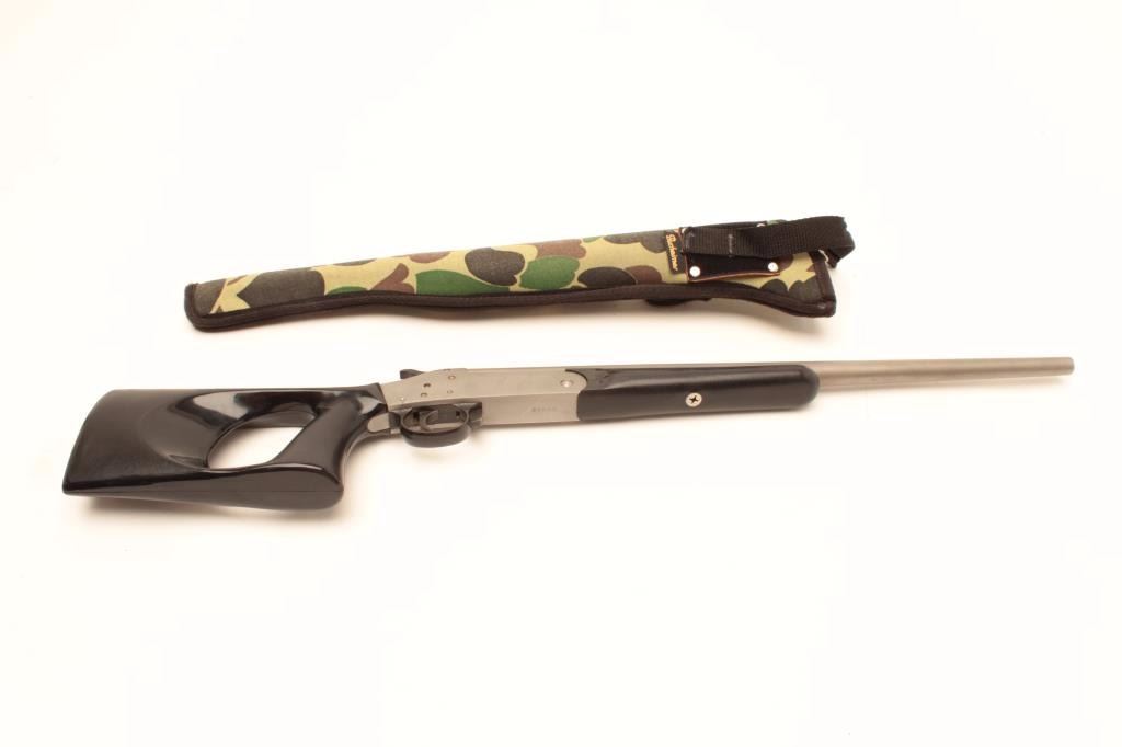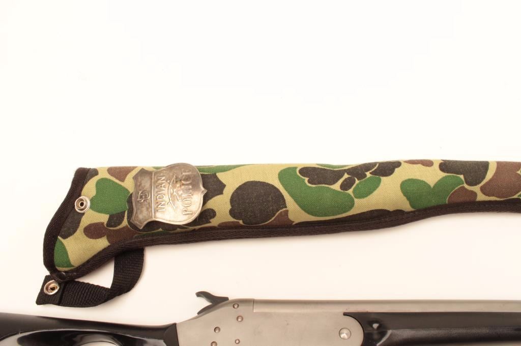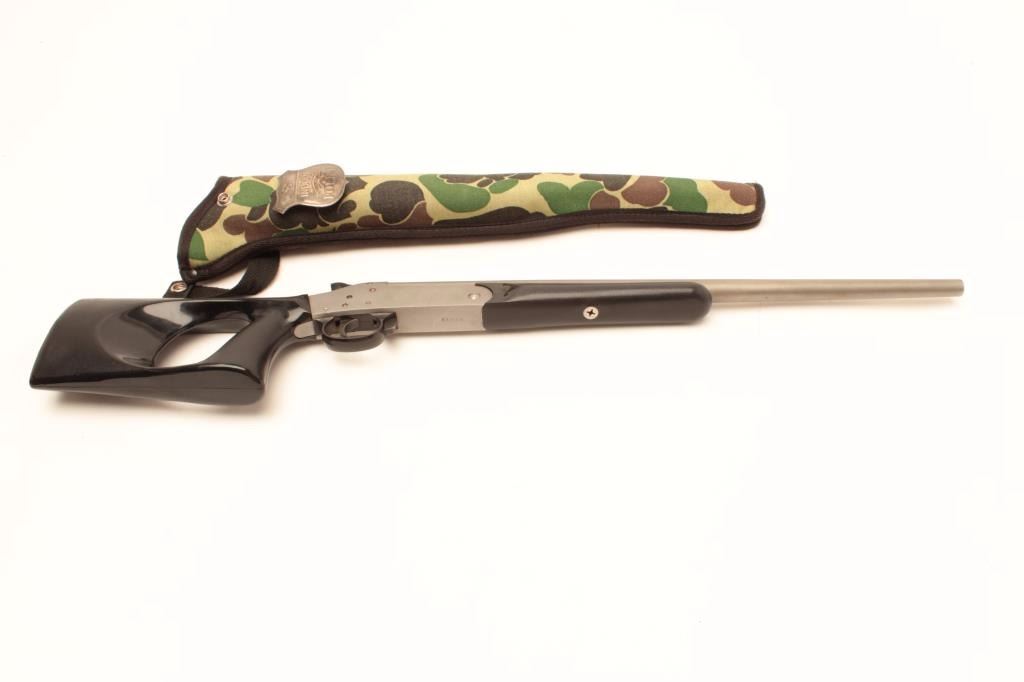 H. Koon “Snake Charmer” Model single shot shotgun, .410 gauge, stainless with black plastic stock, S/N 51850, accompanied by a camo woven scabbard and reproduction Indian Police badge. The gun is in overall verygood + condition with crisp action and very good to fine bore; stock is very good overall. (Modern/No PPT). Est.: $150-$300.