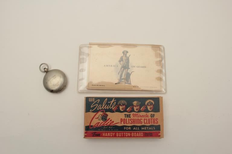 Old military lot including a, “ USANITE”, World War I vintage military compass marked, “ENG. DEPT. U.S.A. 1917”, in good overall condition with a nice grey patina. Additionally, the lot includes a fine example of Black Americana advertising with a World War II era Cadie button polishing cloth and button board in the original box. The last items are W W II era war rationing books with coupons and a WWII Postal Savings Plan bookof United States Defense Savings Bonds stamp album. An interesting lot of WW I and WW II era ephemera. $50-100.