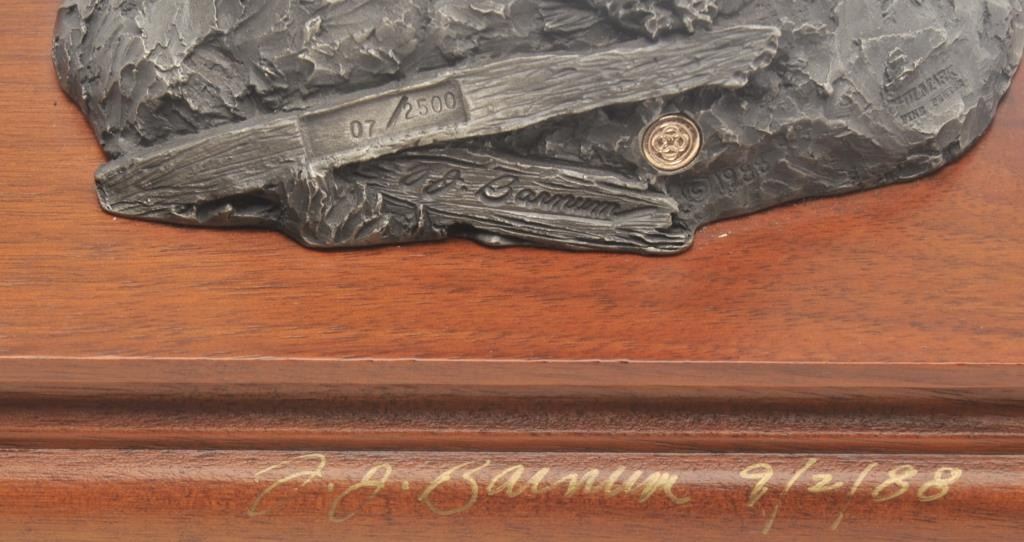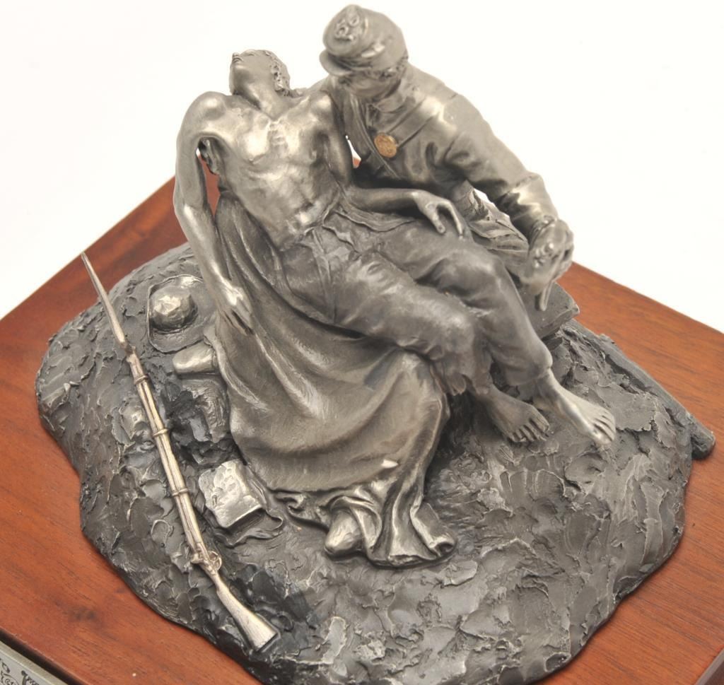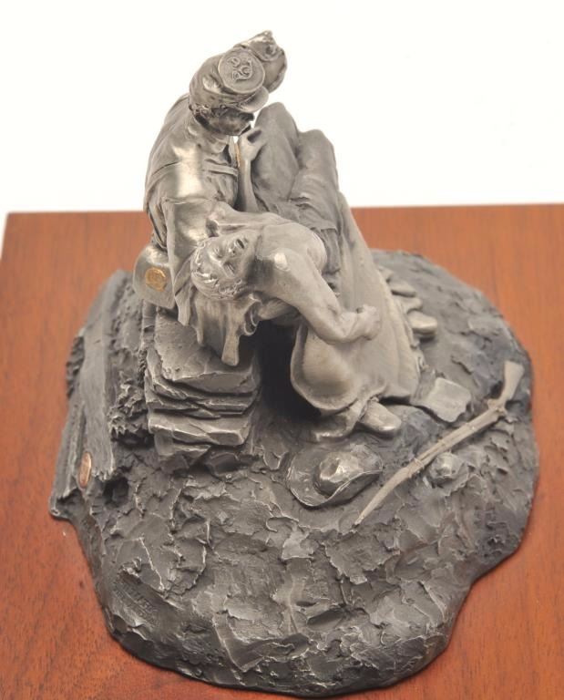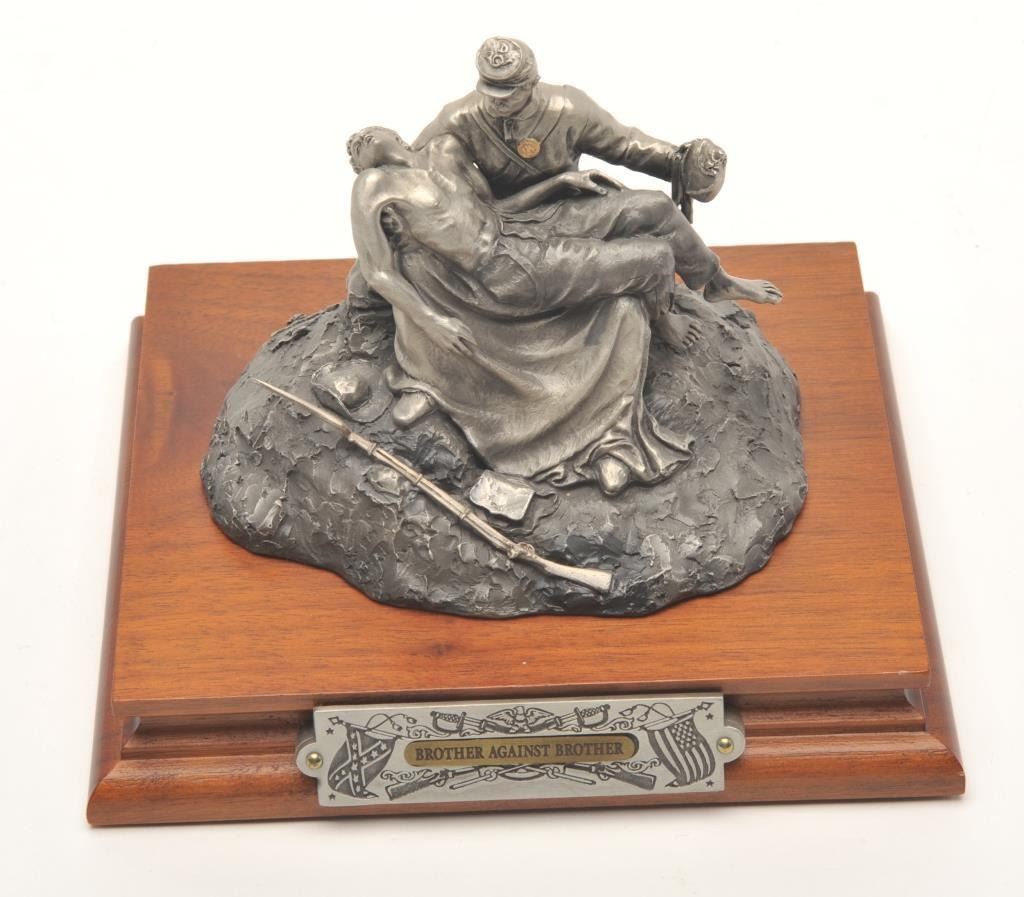 Pewter sculpture by Fran Barnum and issued by Chilmark Collectors Society entitled “Brother Against Brother”, #007/2500, approximately 5” in height including wood base with Certificate of Registration signedand dated Oct. 17, 1988. Est.: $250-$500.