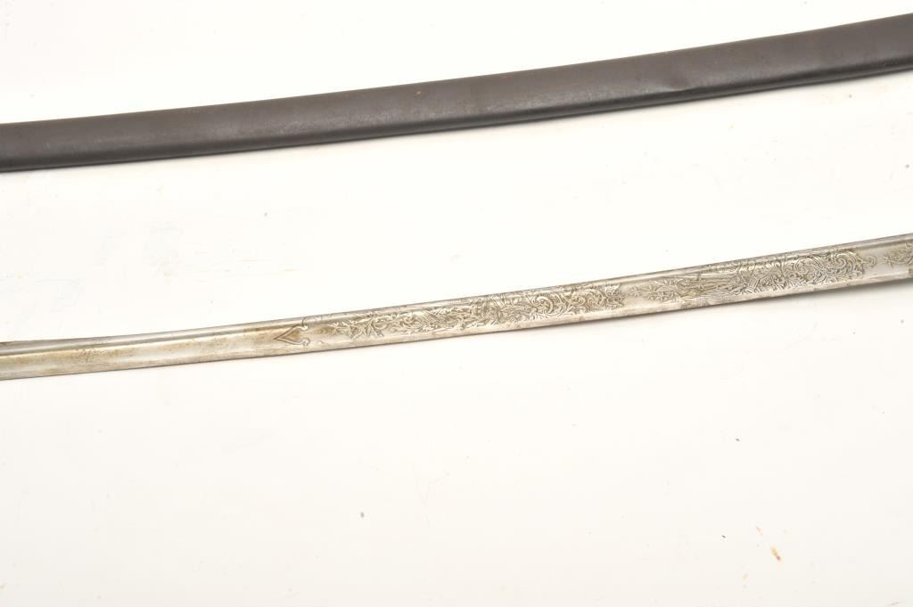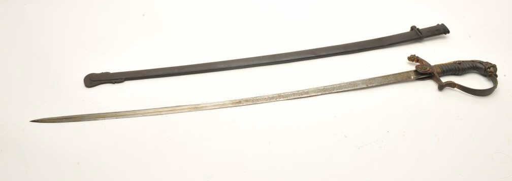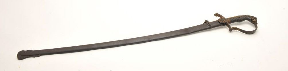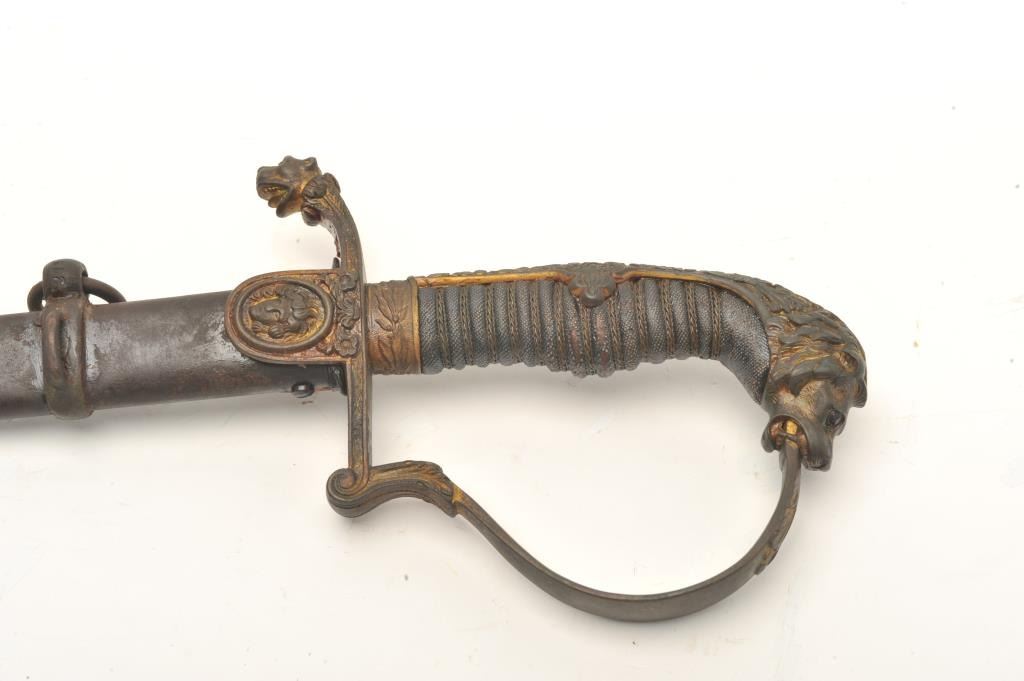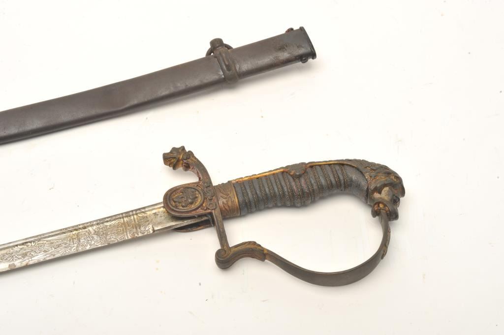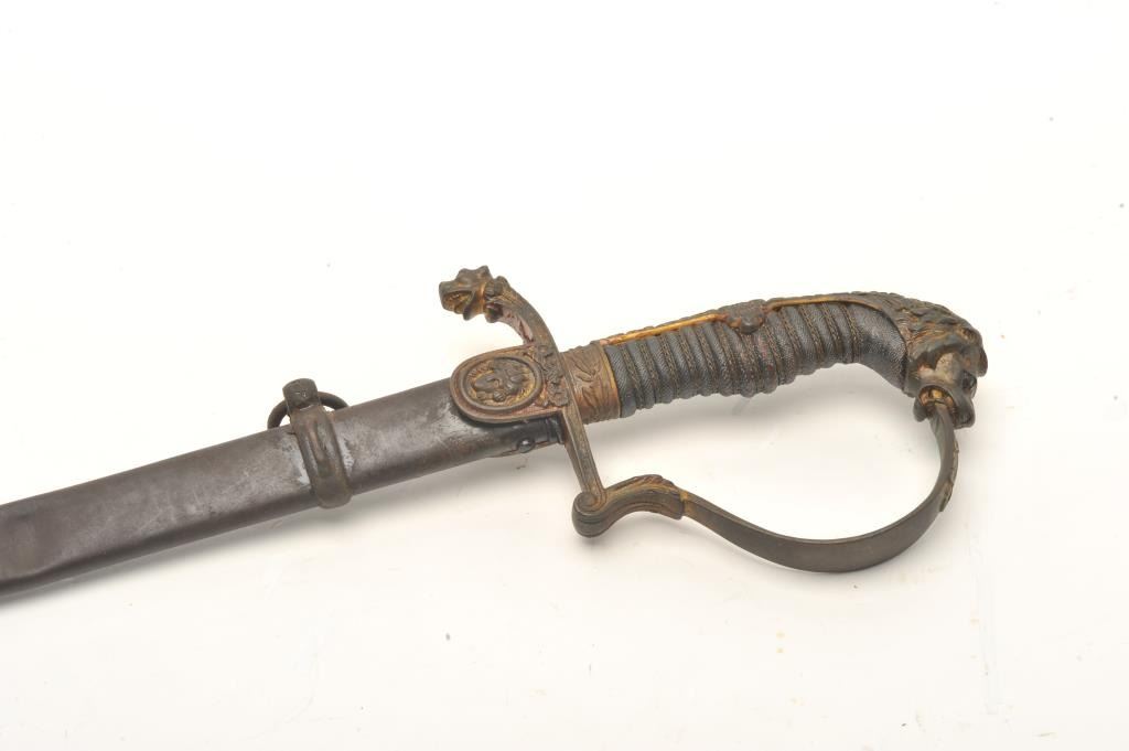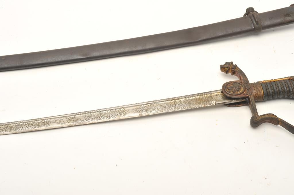 Imperial Austrian Officers sword with scabbard. The sword is in good overall condition with a 30 ½” blade and an overall length of 36”. The blade is marked, “EISENHAUER” and features significant reliefengraving. The blade has been sharpened and shows scabbard wear. The cast handguard features a wire wrapped ray skin grip with a lion’s head pommel. The steel scabbard has taken a dark patina with several small dentsand a total length of 31 ½”. Est.: $175-350 ..