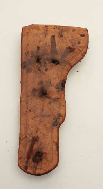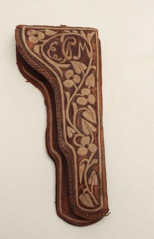 Mexican pitiado decorated leather holster and leather cartridge belt, ca. early 1900’s, with initials “E.P.M” incorporated in the pitiado decoration on front of holster; overall fair to good condition; needs somere-attachment of holster to back panel but stitching of holster is good; belt shows some flaking. Est.: $150-$300.