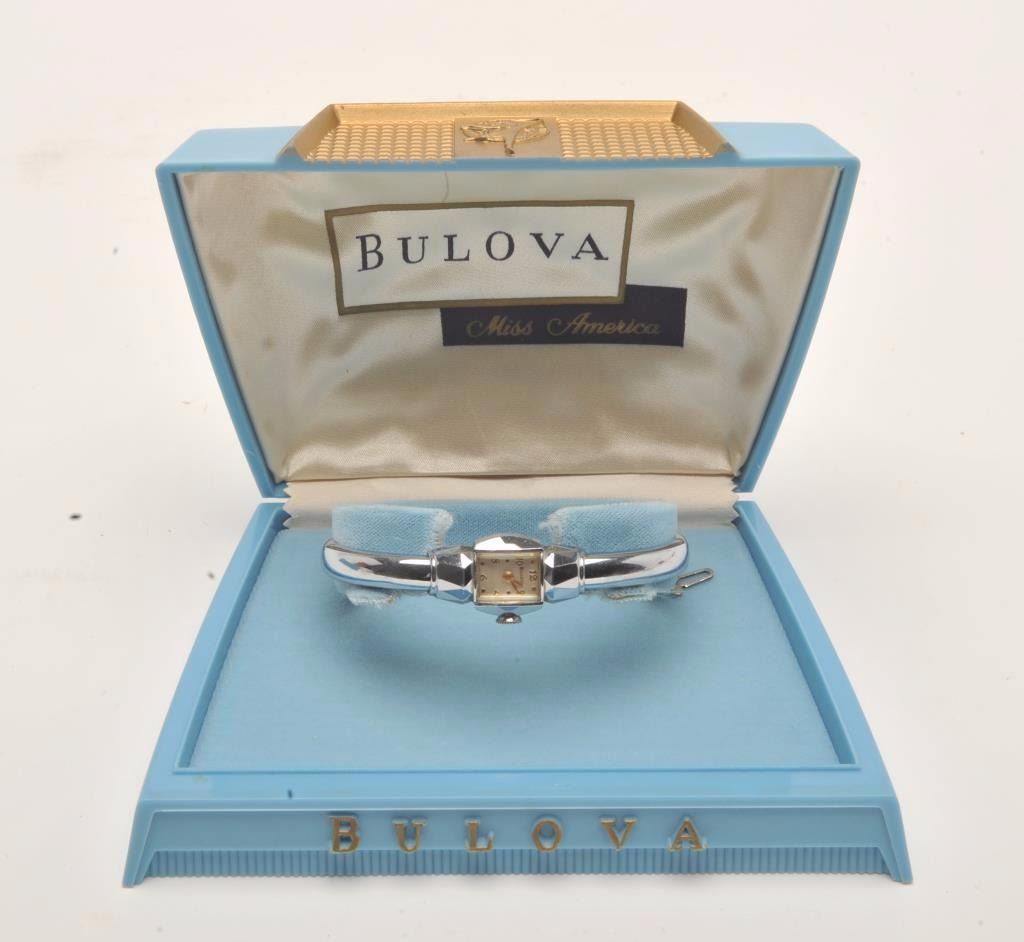 Lot 1326 Vintage ladies “Miss America” wrist watch by Bulova in factory plastic display case and with facto