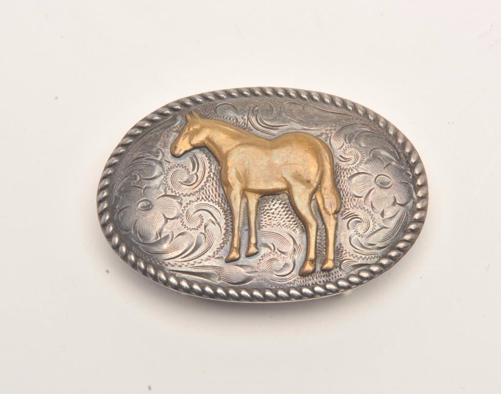 Horse belt buckle, sterling and brass, by Diablo Mfg. Co. Est.: $50-$100.