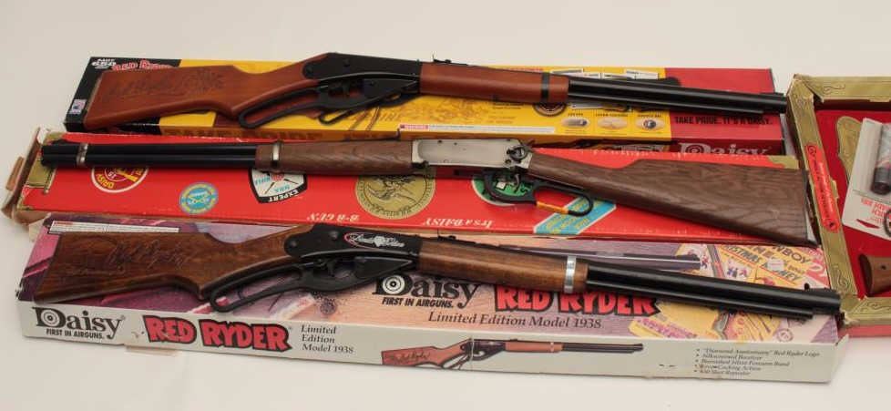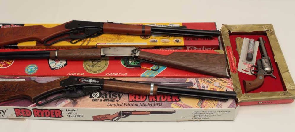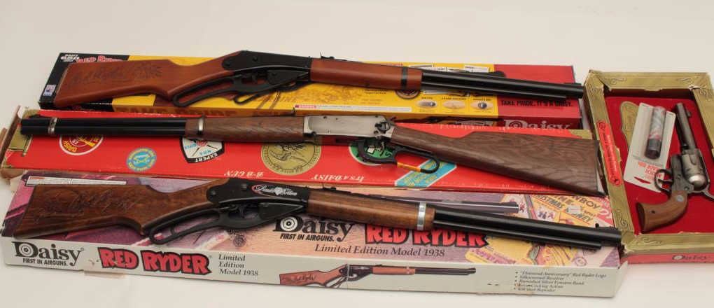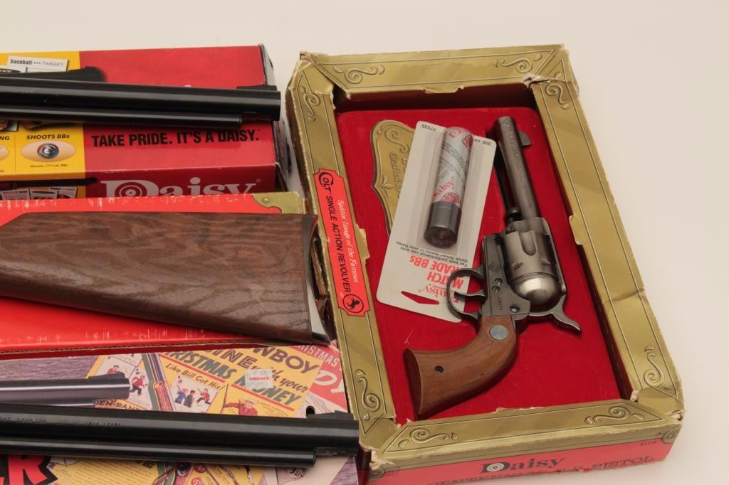Bonanza lot of 4 BB guns including a Daisy NRA Centennial copy of a Colt SAA revolver in factory cardboard box; a Daisy NRA Centennial carbine in factory cardboard box; a Daisy Red Ryder limited Edition Model 1938commemorative rifle in factory cardboard box and a Daisy Red Ryder carbine in factory cardboard box, all appear to be in near new condition Est.: $75-$150.