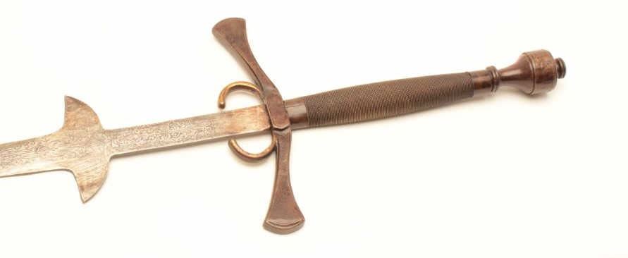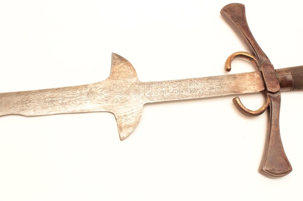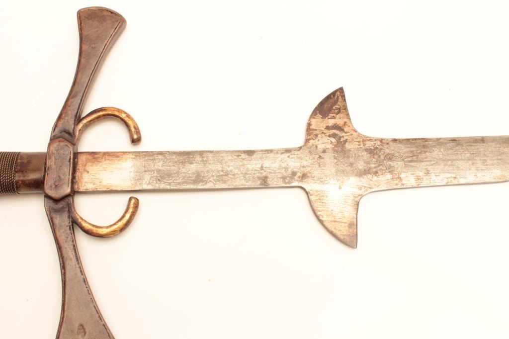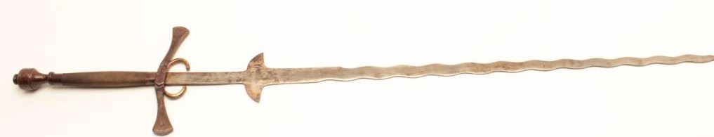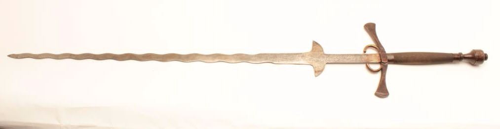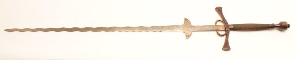 Large reproduction two-handed sword, approximately 57.5” overall with a 45” wavy blade. Est.: $125-250