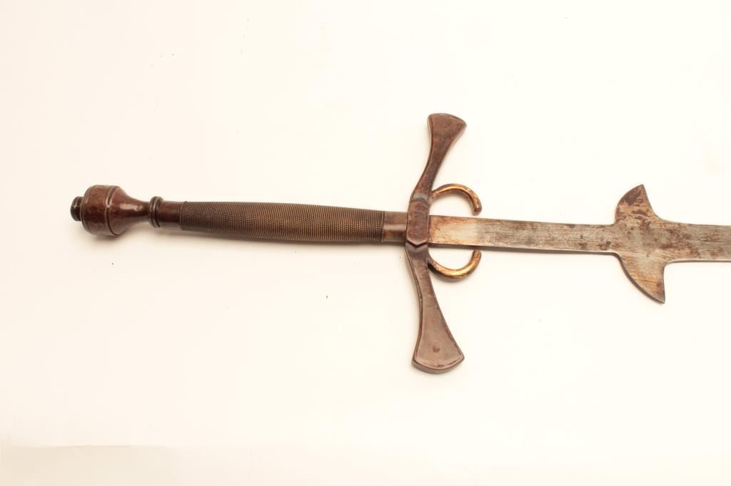 Lot 1344 Large reproduction two-handed sword, approximately 57.5” overall with a 45” wavy blade. Est.