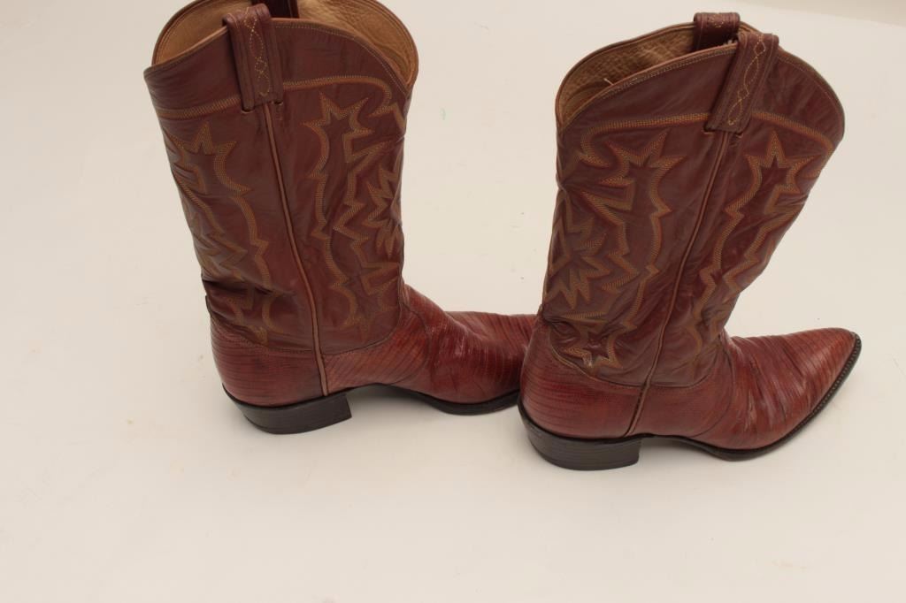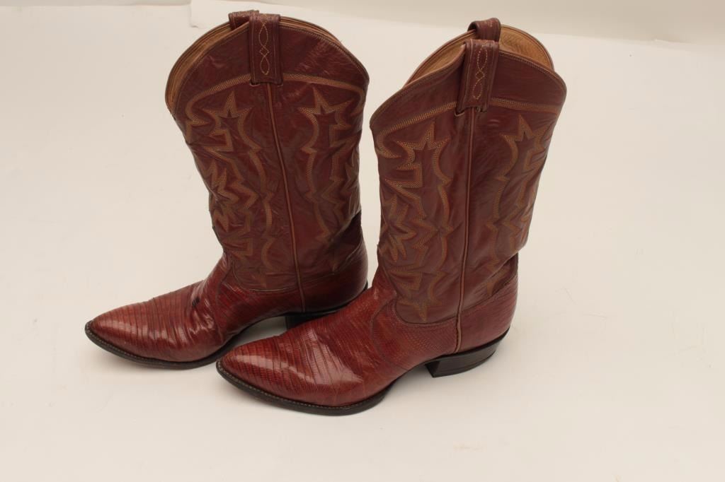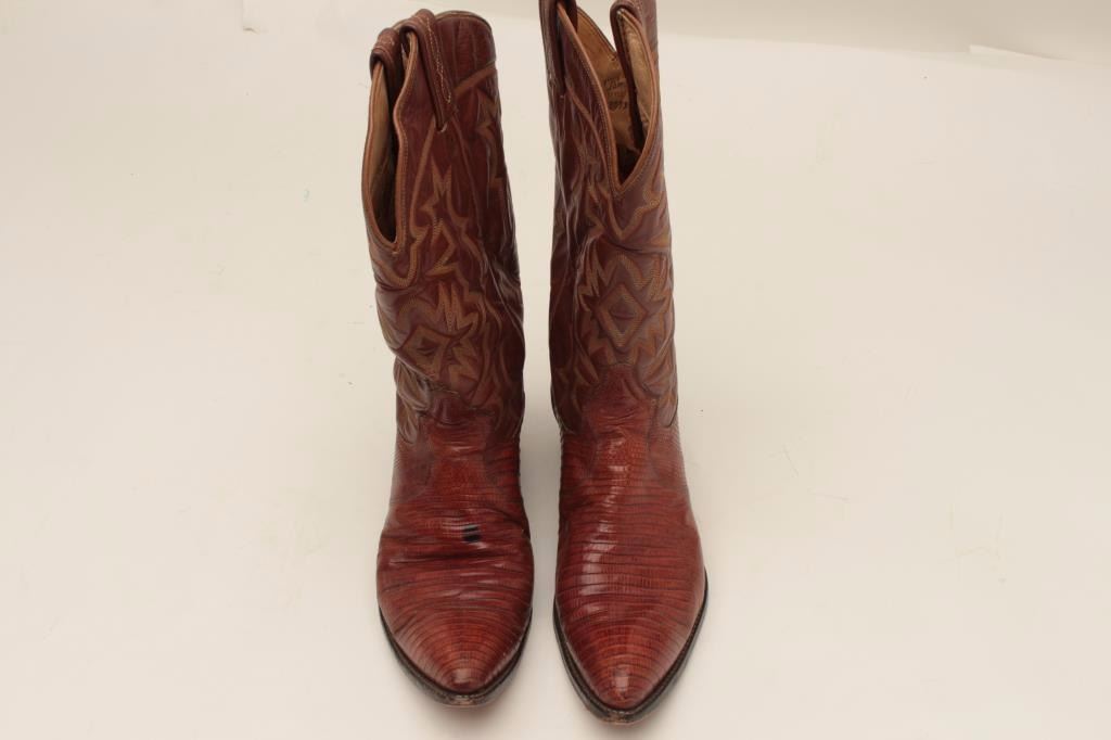 Pair of man’s size 8 chocolate colored lizard skin boots in box; very good condition. From the estate of Elmer E. Taylor. Est.: $50-$100.