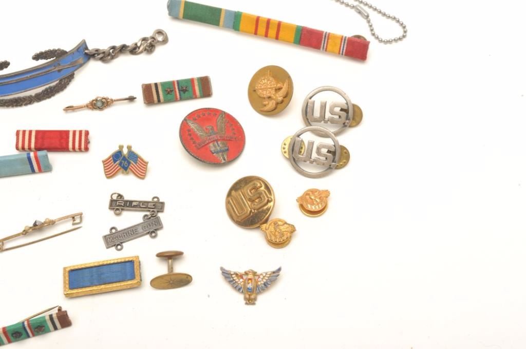 Lot of approximately 22 misc. U.S. military pins, buttons, ribbons, etc. and a pair of G.I. dog tags. Est.: $50-$75.