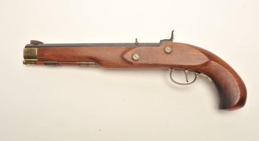 Jukar percussion pistol, .45 caliber, serial #126475. The pistol is in very good overall condition with a 10” octagon barrel. The barrel features a knife blade front sight and retains nearly all of its brownedfinish.The side plate shows muted case color while the trigger guard is brass. The smooth wood stock is in very good condition. A nice, Spanish made reproduction percussion pistol. Est.: $100-$200.