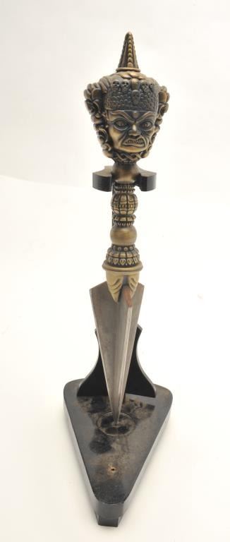 Reproduction of a Phurba Dagger, approximately 13.5” overall with display stand in cardboard shipping box that states “a licensed reproduction of the knife used in the film “The Shadow”. Est.: $35-$50.