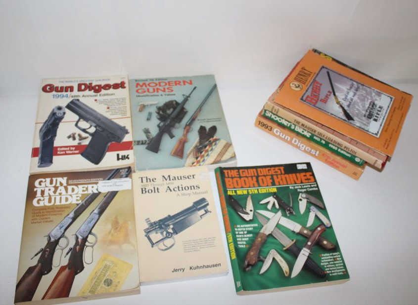 Lot of 10 misc. gun-related books including different editions of Gun Digest, Kuhnhausen’s “The Mauser M91 Through M98 Bolt Actions: A Shop Manual”, “The Mauser Self-Loading Pistol” by Belford and Dunlapand others. Est.: $50-100
