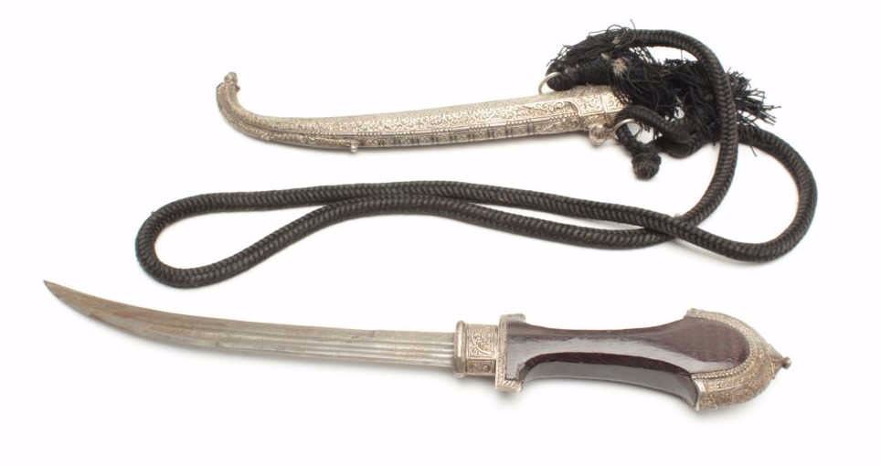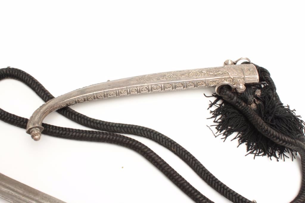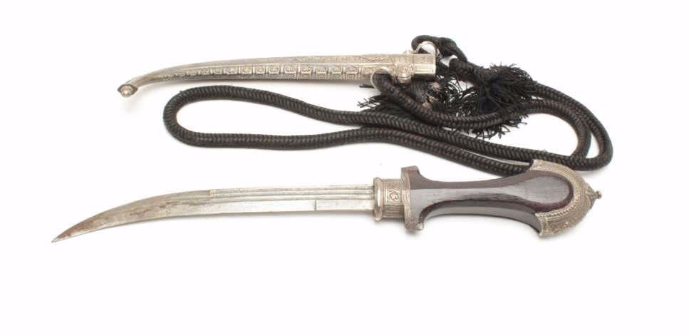 Jambia knife with hammered metal scabbard, approximately 17” overall, wood grip and black woven cord hanger. Est.: $200-$400.