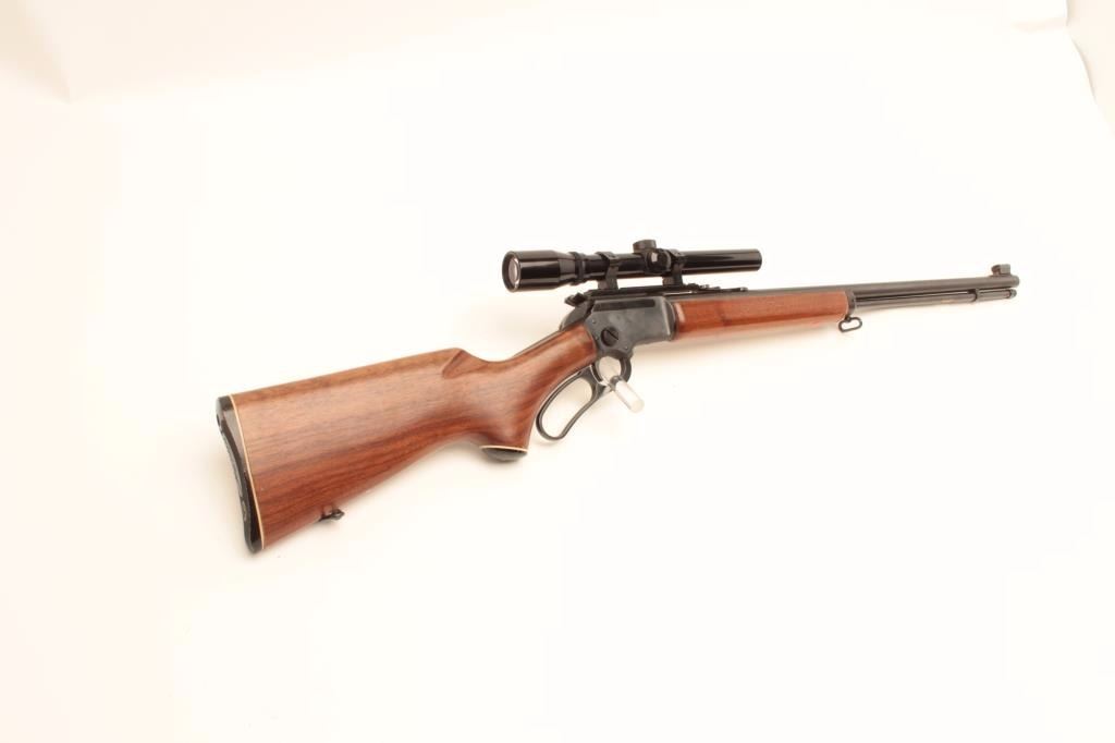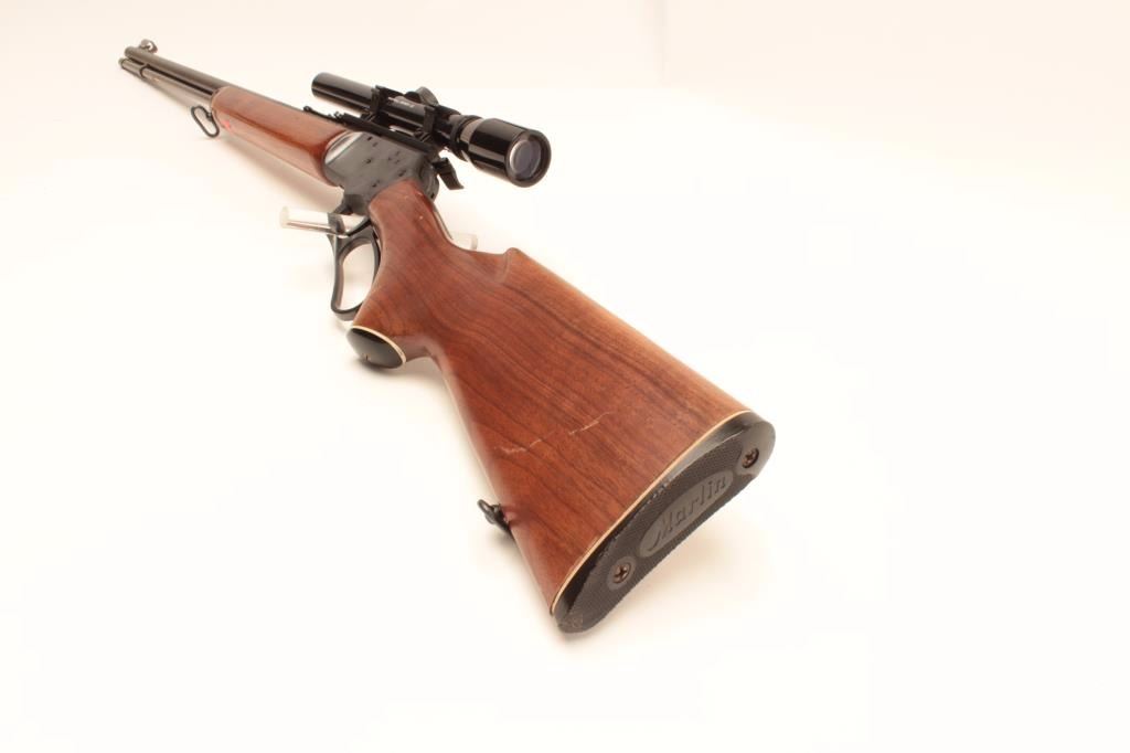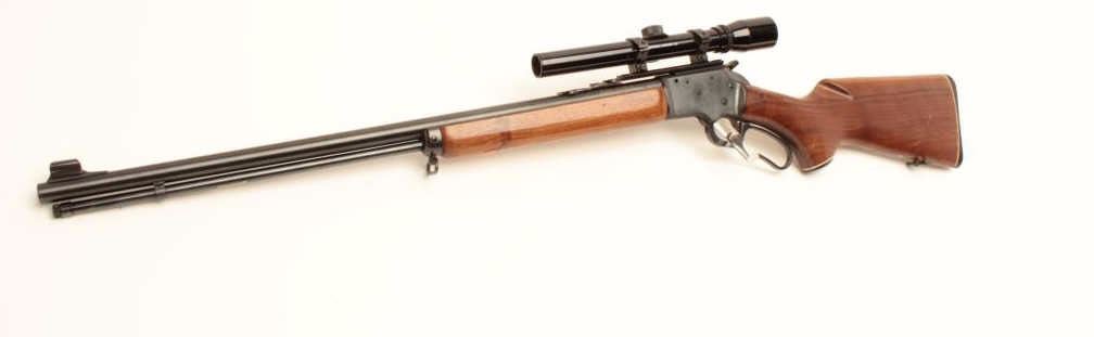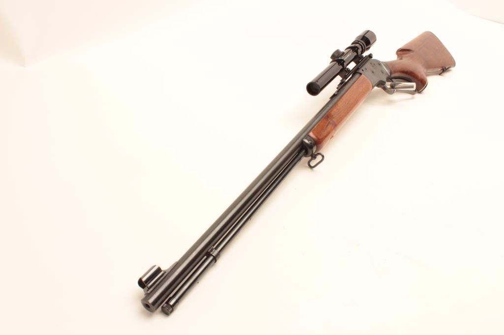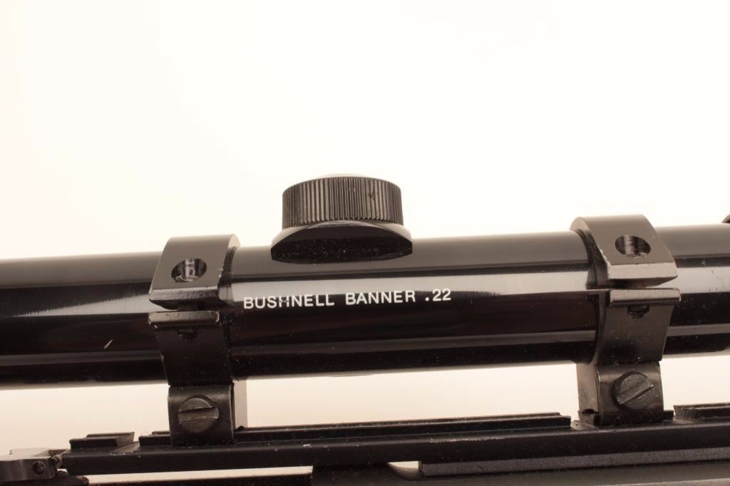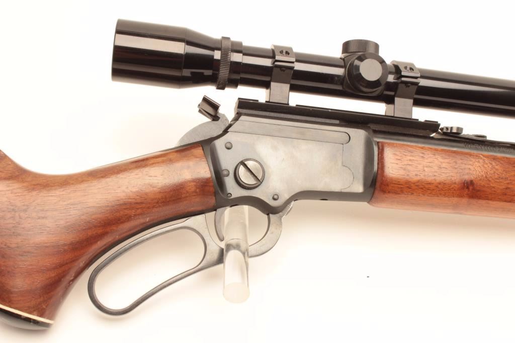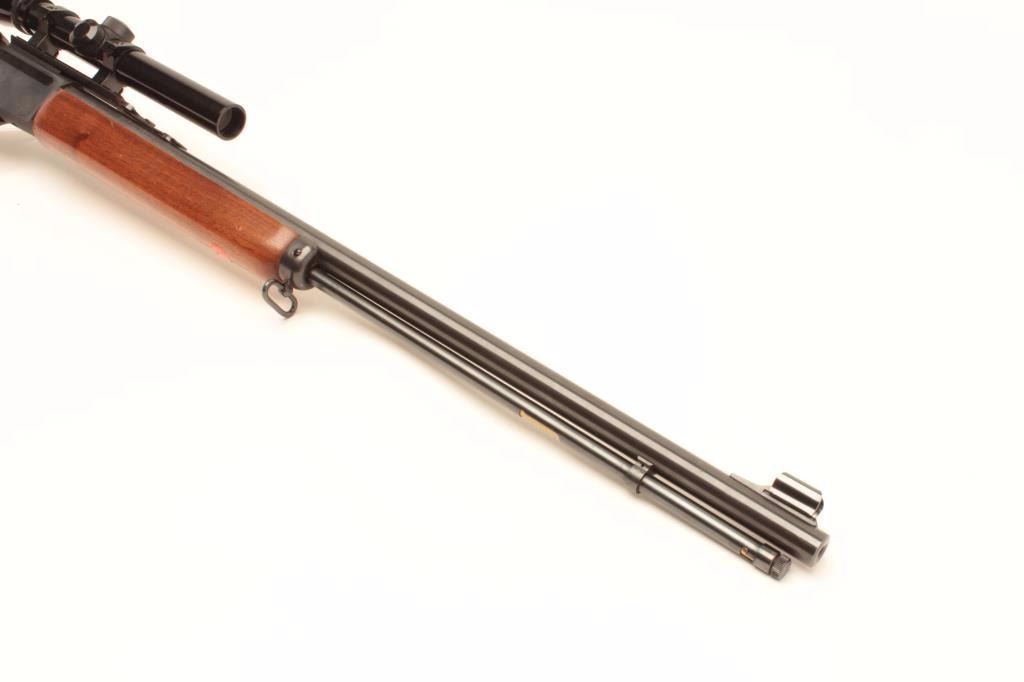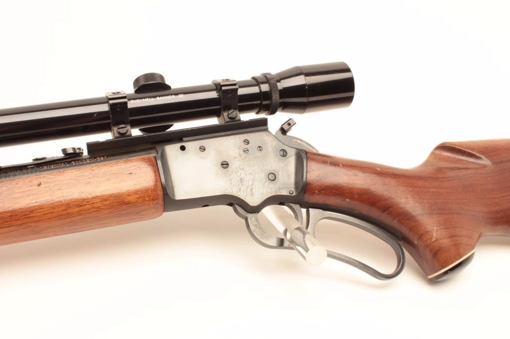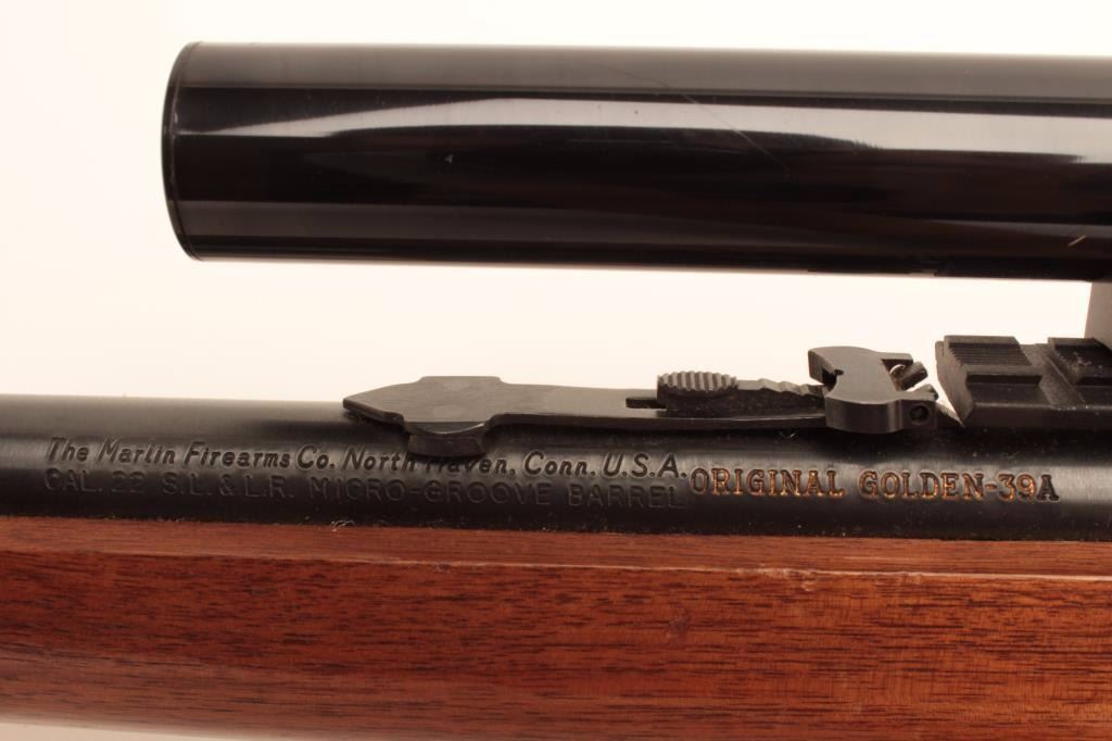Marlin Model Golden 39A lever action rifle, .22 short, long and LR caliber, 24” barrel, blued finish, wood stocks, S/N 18273040, mounted with a Bushnell Banner .22 scope with good optics, in overall very good to finecondition with majority of its original blued finish, very good + bore, crisp action and fine wood. (Modern/No PPT). Est.: $250-$500.