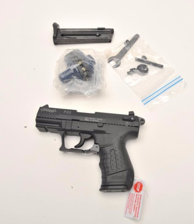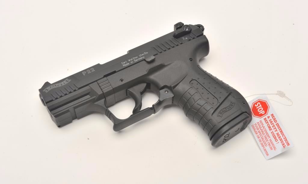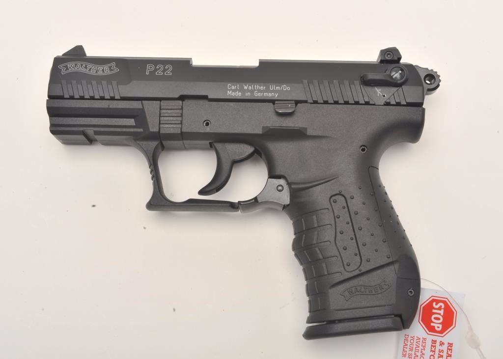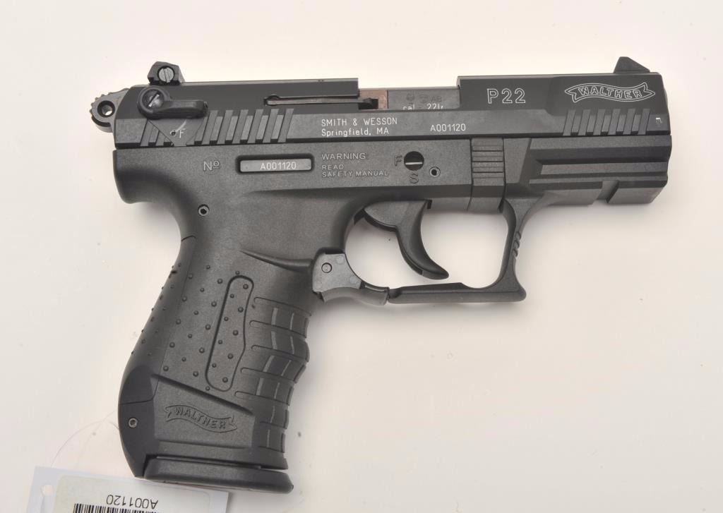 Walther Model P22 semi-automatic pistol, .22LR caliber, 3.5” barrel, black finish, S/N A001120, in overall like new condition with factory hardcase, one extra magazine and instructions. (Modern/No PPT).Est.: $250-$500.