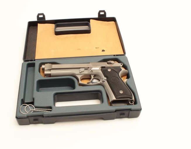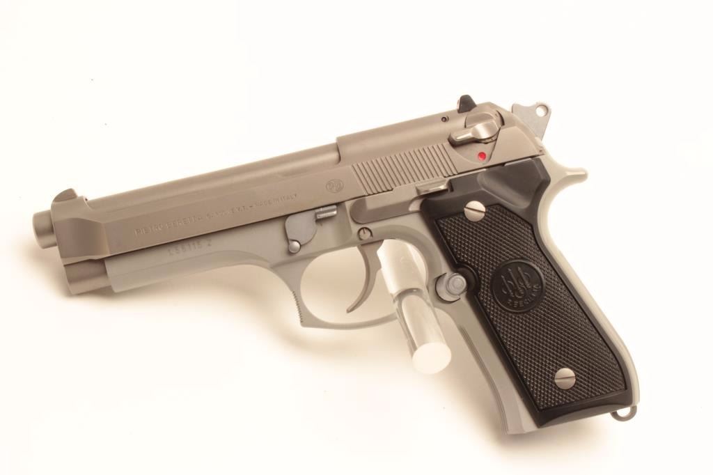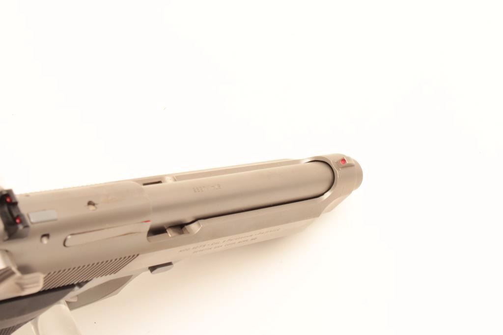 Beretta Model 92FS semi-automatic pistol, 9mm caliber, 4.5” barrel, stainless, checkered black grips, S/N L 55115 Z, in factory hardcase and cardboard sleeve with end label numbered to this gun; also with instructionsand one extra magazine. Pistol is in overall like new condition. (Modern/No PPT/NO CALIF. SALE). Est.: $400-$800.