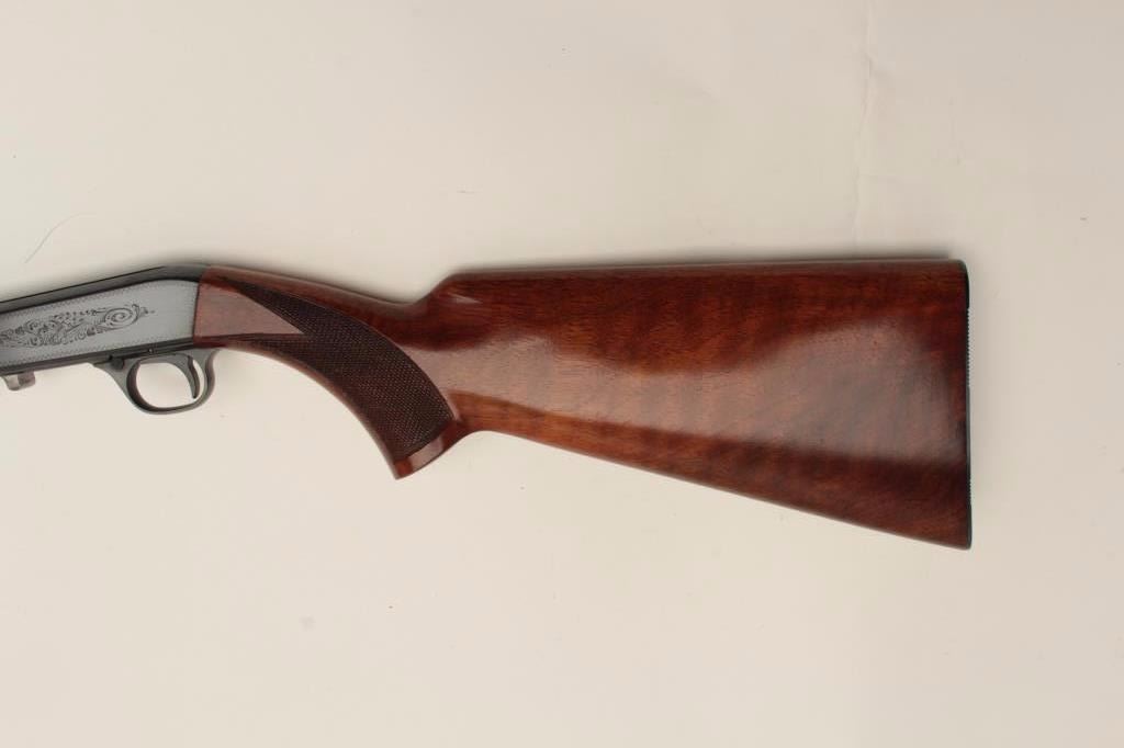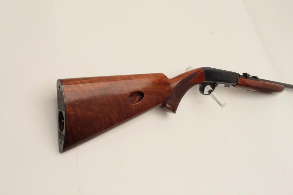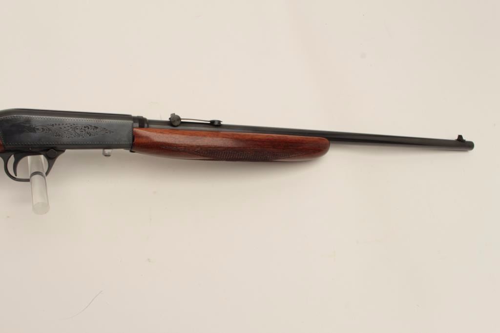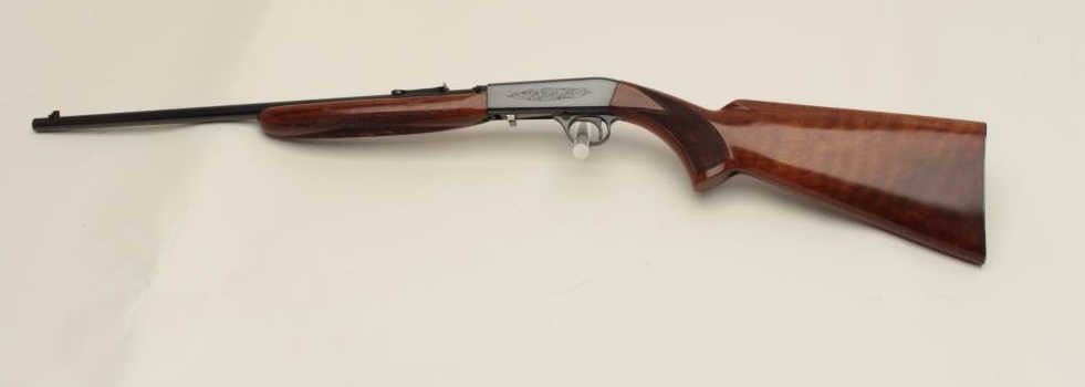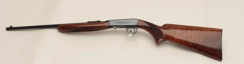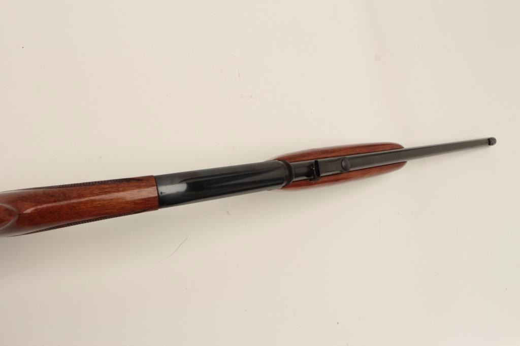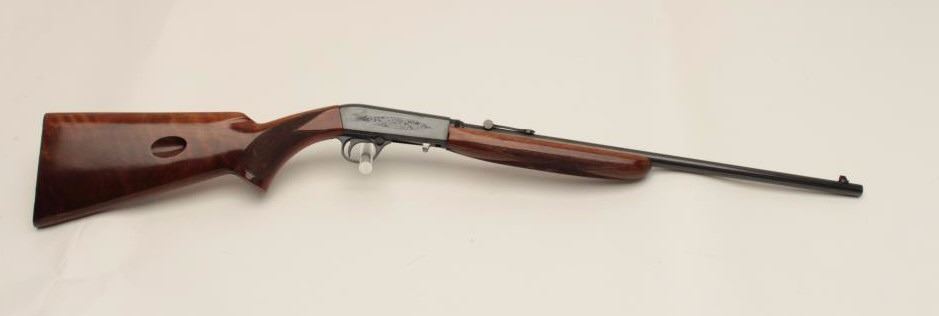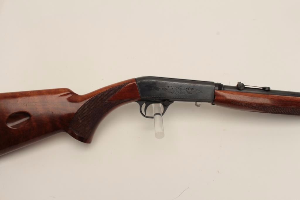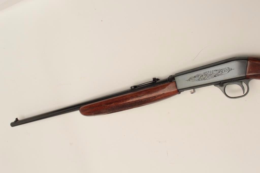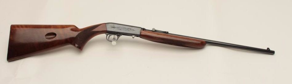 Belgian-made Browning takedown semi-automatic rifle, .22LR caliber, 19” barrel, blued finish, checkered wood stocks, S/N T72439, early “Wheel” rear sight. This rifle is in overall fine condition with the majority ofits original finish, fine bore, action and markings, near fine wood with some scattered storage scratches. (Modern/No PPT). Est.: $300-$600.