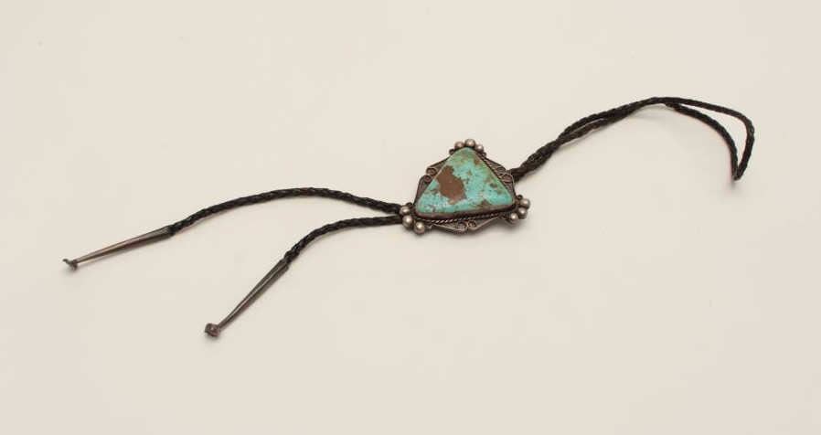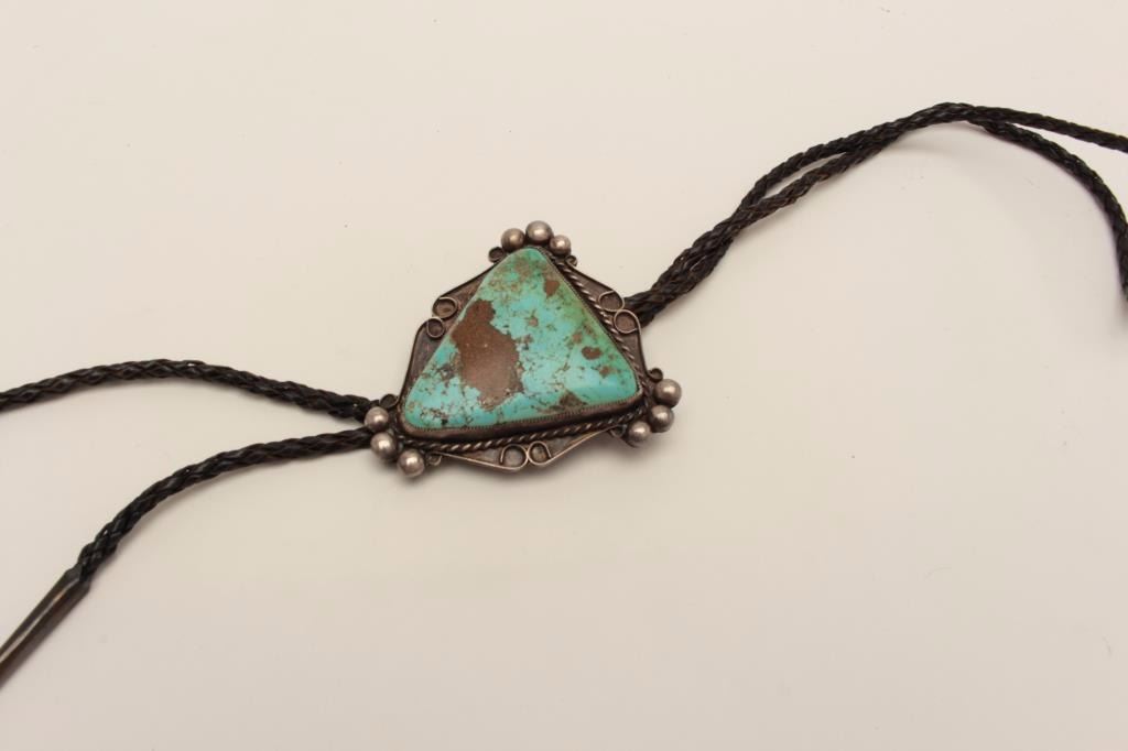 Bolo Tie in Sterling Silver mounted with large nugget of turquoise. Pre 1979. Est$150-300