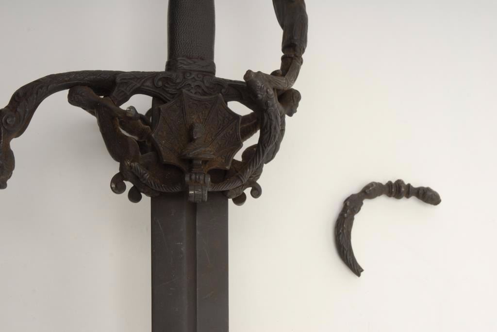 Ornate broadsword from Victorian era with fancy cast metal mounts and great patina. During the 19th century armourer’s like Schmidt created decorative arts in the form of arms and armour to decorate and restorethe collections in the castles and great halls of Europe. Measure 46” overall. Very impressive, one piece of handle broken off but saved. $700-1,400
