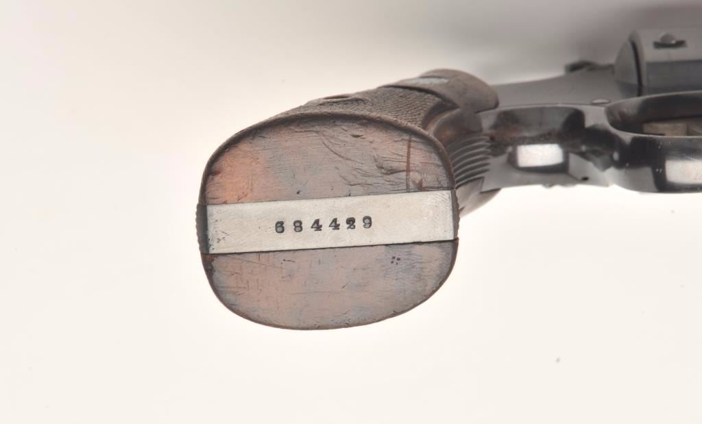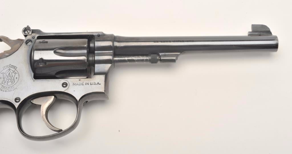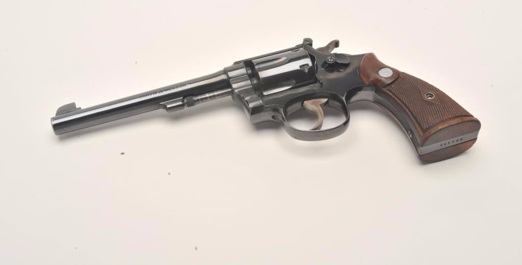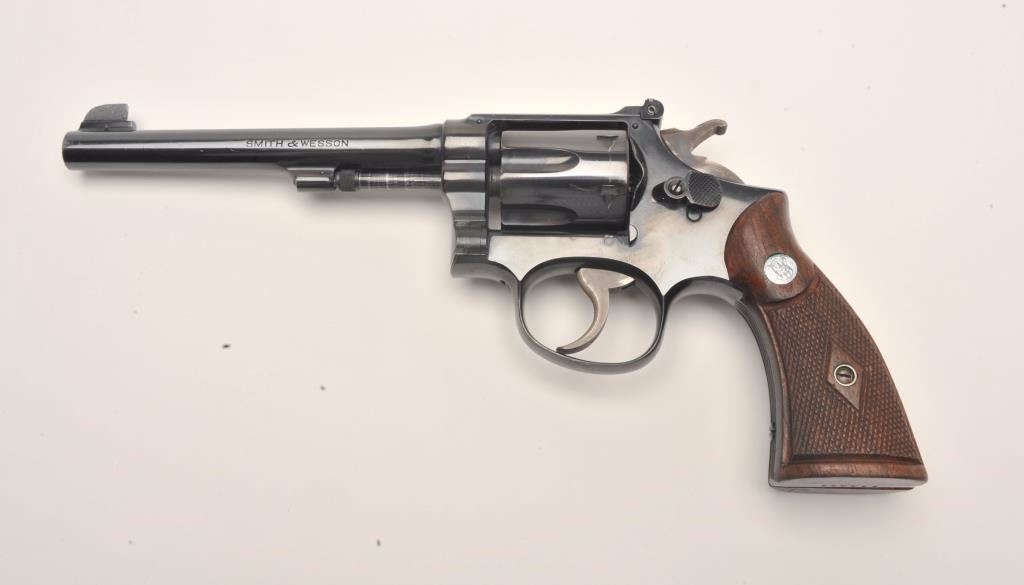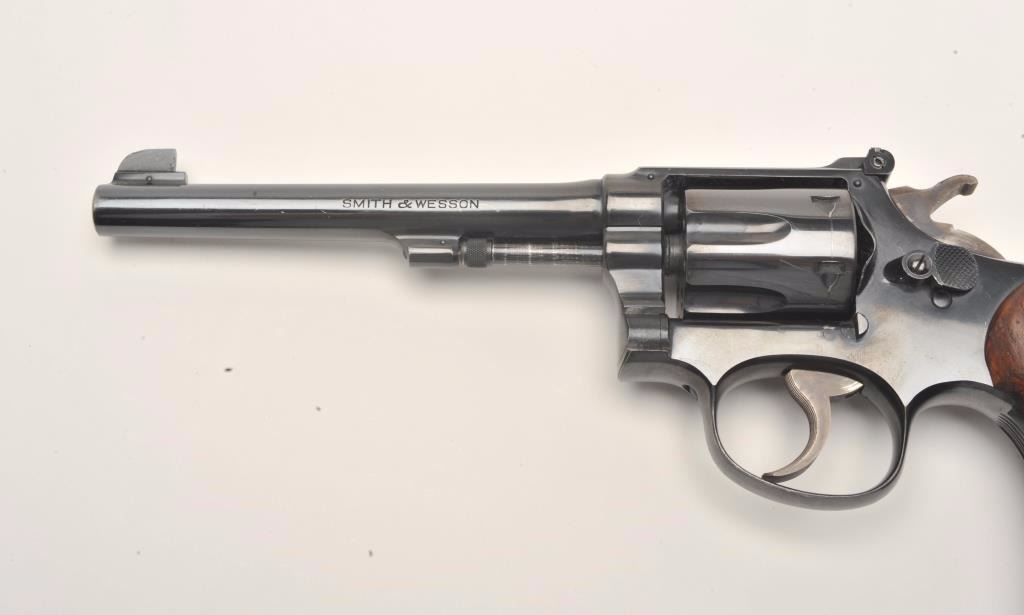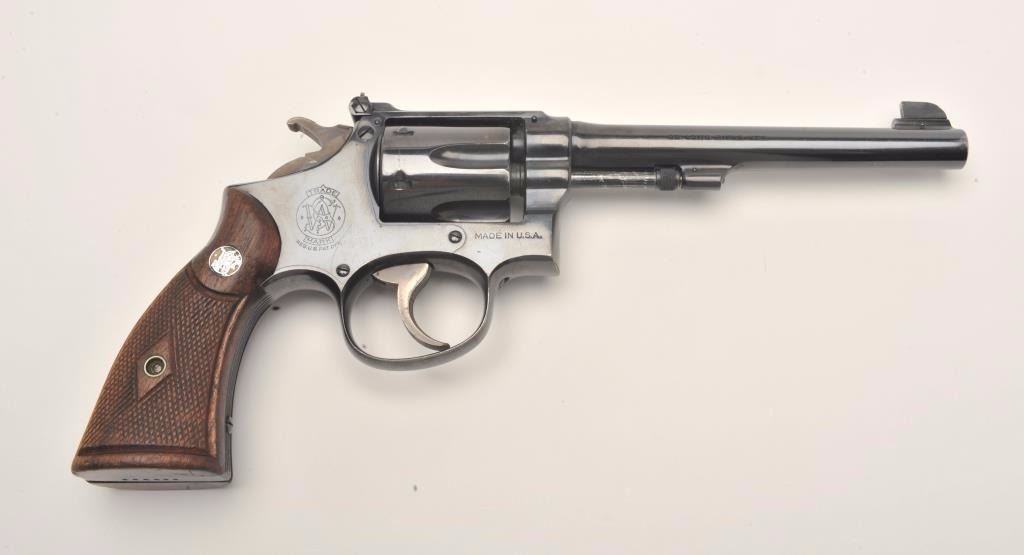 Smith and Wesson K-22/40 Masterpiece revolver, .22 Long Rifle caliber, Serial #684429. The pistol is in nearly excellent overall condition with a 6” barrel featuring micro-click adjustable target sights. The pistol retains approximately 95% of its original blue finish with light wear at the muzzle and a faint drag line on the cylinder. The pistol has a five screw frame with vivid case color noted on the hammer and trigger. The medallion checkered wood grips are in very good to nearly fine condition with handling marks and small mars. The bore is very good, the action is crisp and markings are sharp on this desirable K-22 2nd model. The lot includes a Smith and Wesson factory letter confirming all features as described and indicating that the pistol was shipped to Von Lengerke & Antoine, 33 Wabash Ave., Chicago, IL on March 11, 1940. Theletter further states the pistol is rare, being one of the first revolvers to bear the K-22 Masterpiece name. From the estate of Larry Gaertner. Est.: $750-$1,500. (C+R)