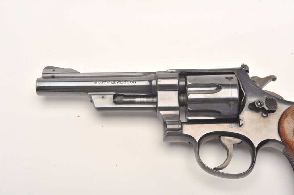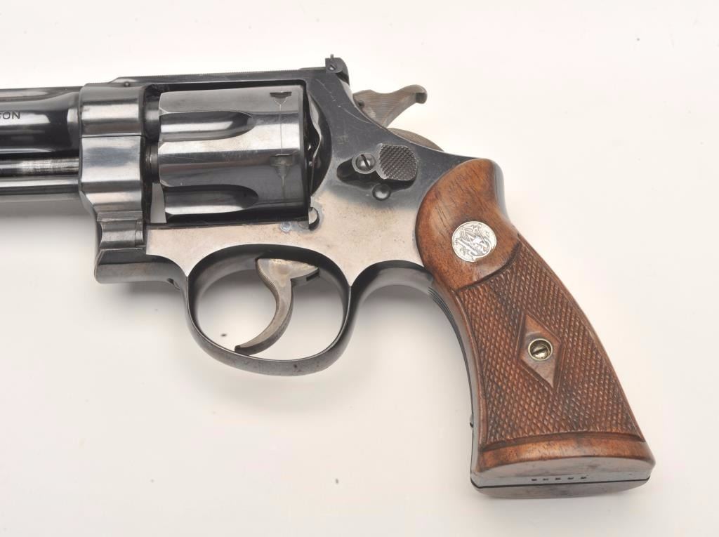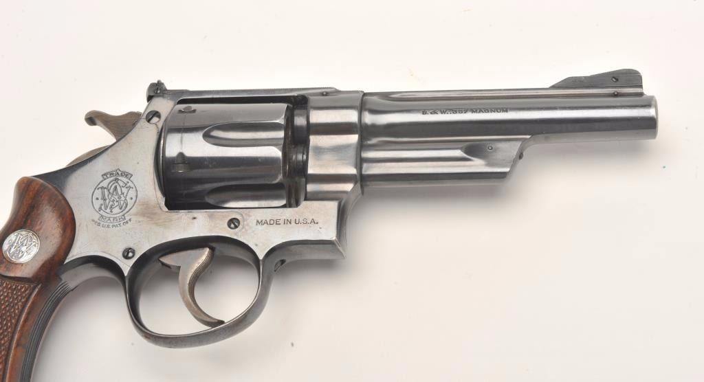 Smith and Wesson Pre-Model 27 “Unregistered” revolver, .357 Magnum caliber, Serial #60238. The pistol is in fine overall condition with a 5” barrel with filed rib, top strap and a King ramp front sight. The pistolretains approximately 95% of its blue finish with light holster wear at the muzzle and a faint drag line. The pistol features muted case hardening on the hammer and trigger. The checkered wood medallion Magna grips arein very good condition showing small mars and compressions consistent with use. The bore is very good, the action crisp and markings are sharp. The pistol includes a Smith and Wesson factory letter which confirms thefeatures and indicates the pistol was shipped to the Police Department, Tucson, Arizona on December 14, 1939. Introduced as a custom manufactured revolver, the .357 Magnums were manufactured to the customer’s specifications and stamped in the yoke cut with a registration number. After returning a registration card, the owner would receive a registration certificate. This process proved too costly and was discontinued after