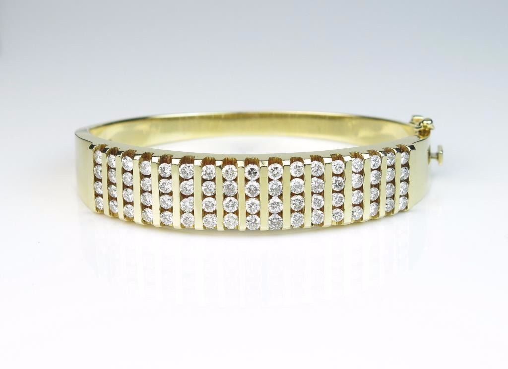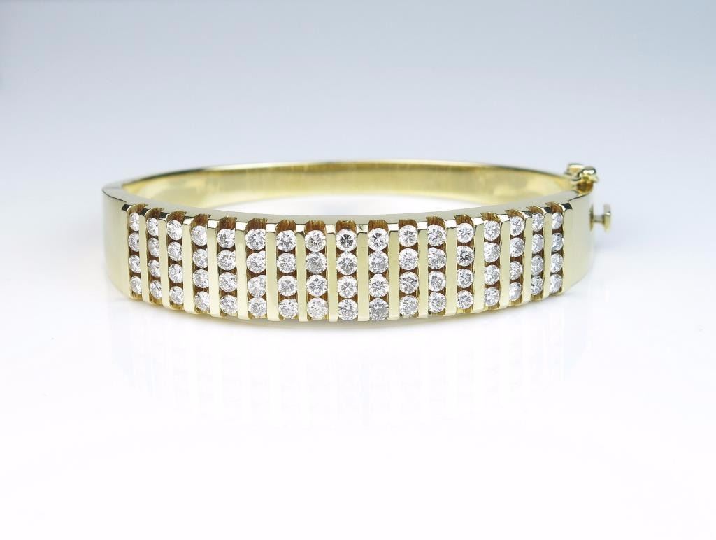Amazing ladies Bangle Bracelet channel set with sixty eight round diamonds with a total weight of approx. 4.50 carats of F-G colors and SI clarity weighing over one ounce in 14 karat yellow gold. Retail $8,000-$12,000Estimates $5,000-$7,000 Nice
