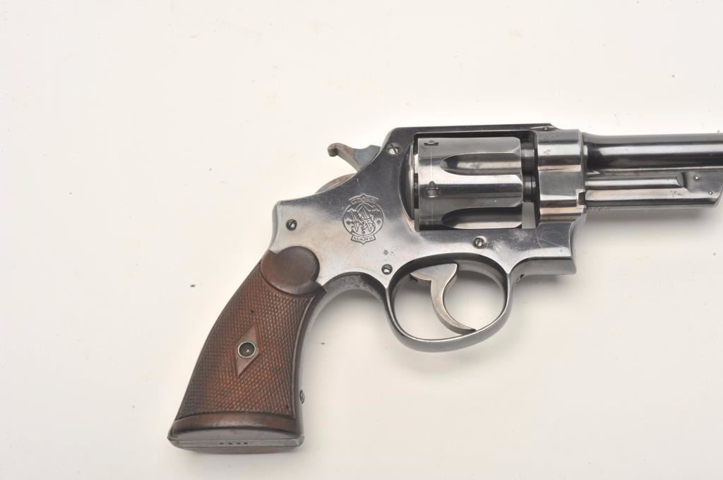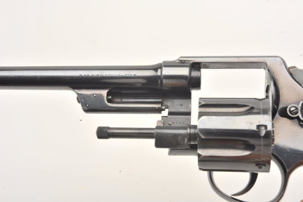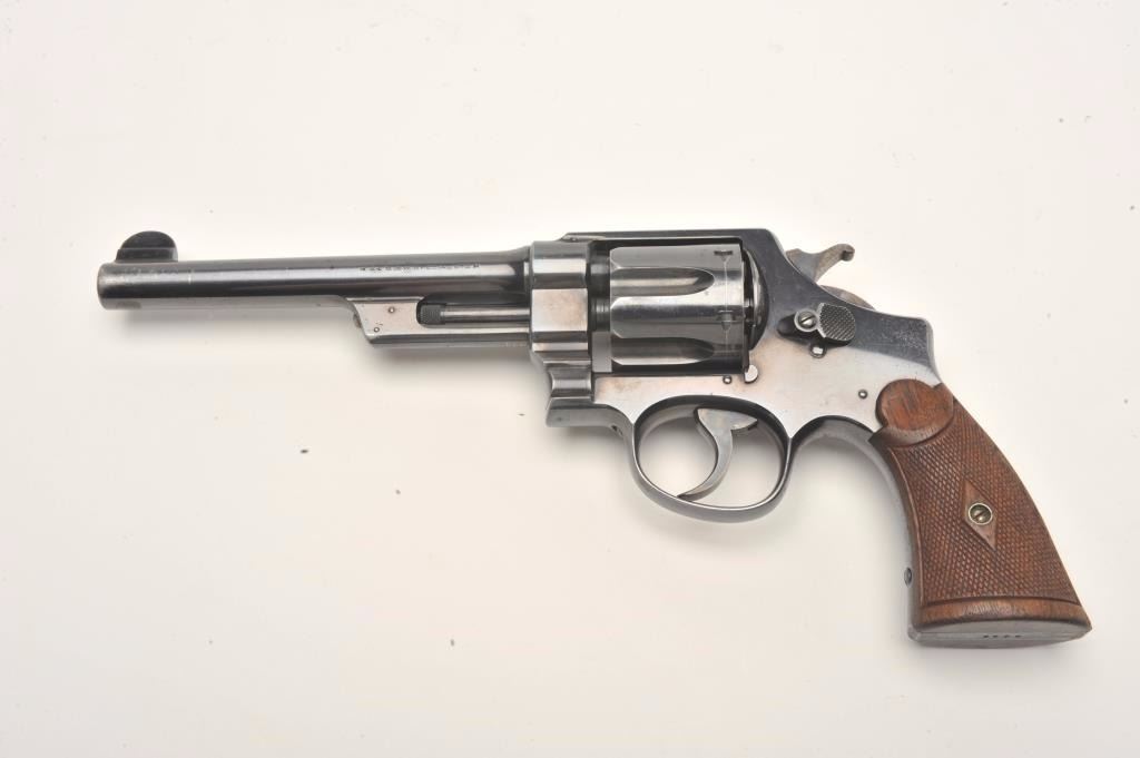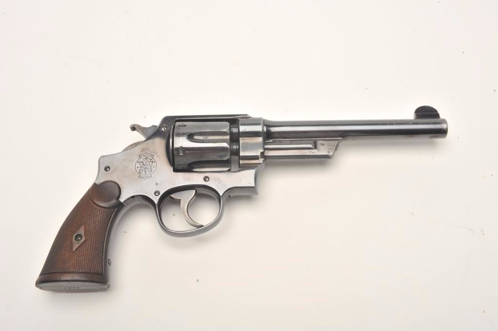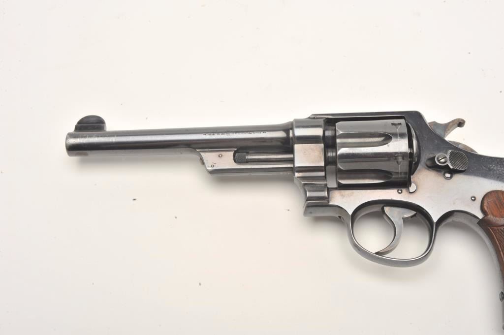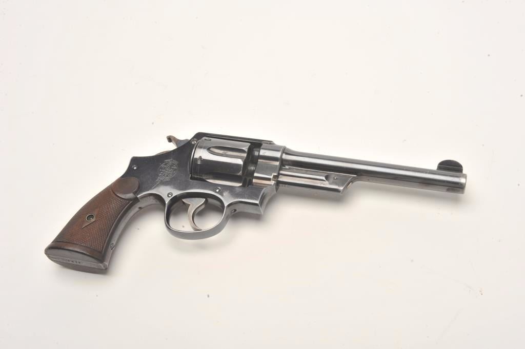 Smith and Wesson 1st Model Hand Ejector revolver, .44 S&W Special caliber, Serial #3466. The pistol is in fine overall condition with a 6 ½” barrel. The pistol retains approximately 85- 90% of its mutedblue finish with wear at the muzzle, light surface rust on the back strap and a drag line on the cylinder noted. The pistol features a five screw frame and vivid case coloring of the hammer and trigger. Thecheckered wood grips are in very good condition with small mars and some flattening of the checkering noted. The pistol has had three small notches added under the ejector rod during the period of use. The bore isvery good, the action crisp and markings are sharp. The pistol includes a Smith and Wesson factory letter confirming all features and indicating the pistol was shipped to Kimball Upson Co., Sacramento, CA on August13, 1912. Also known as the .44 New Century Triple Lock, 1st Model Hand Ejectors were introduced in 1908 and manufactured until 1915. From the estate of Larry Gaertner. Est.: $1,500-$3,000. (C+R)