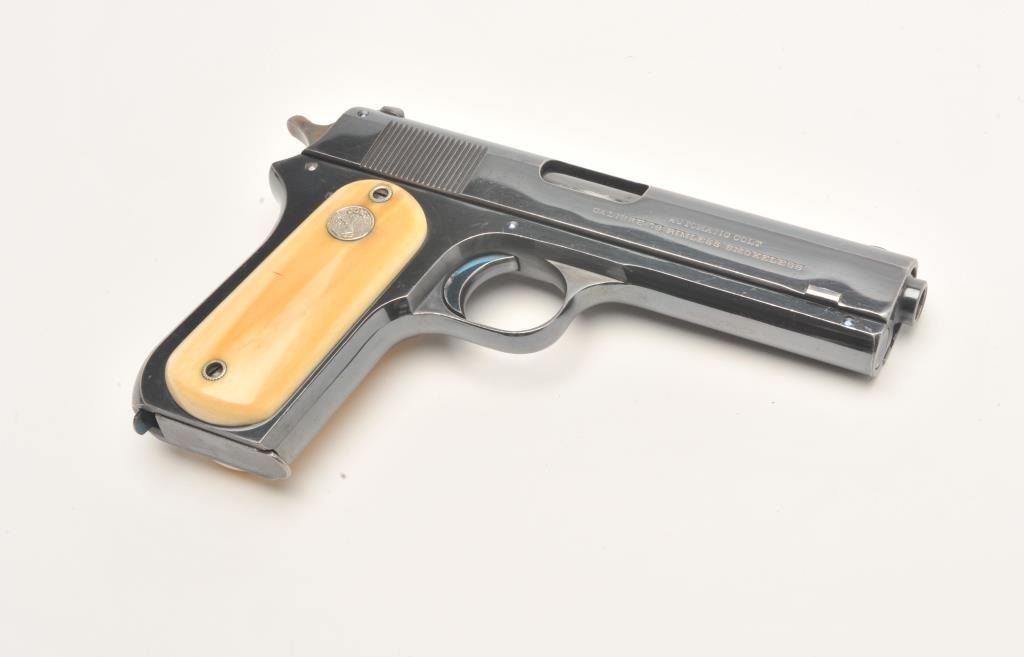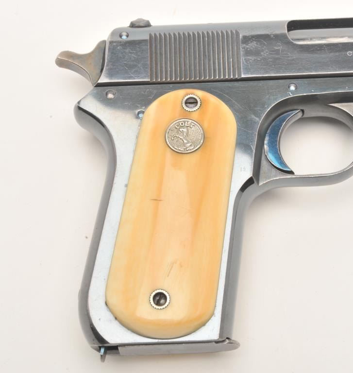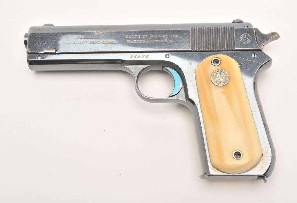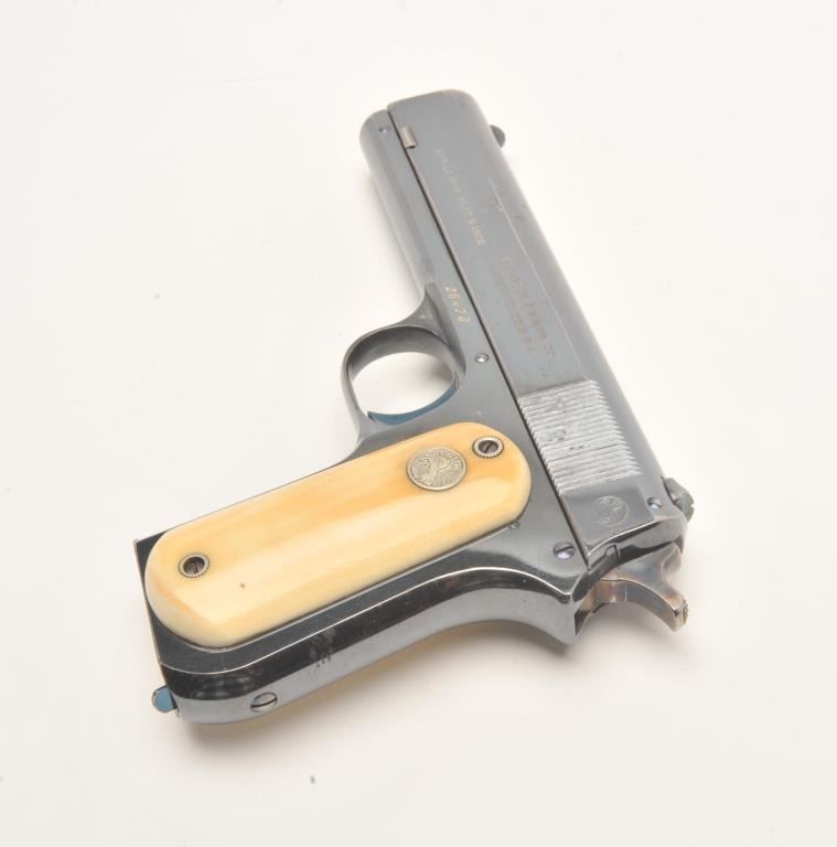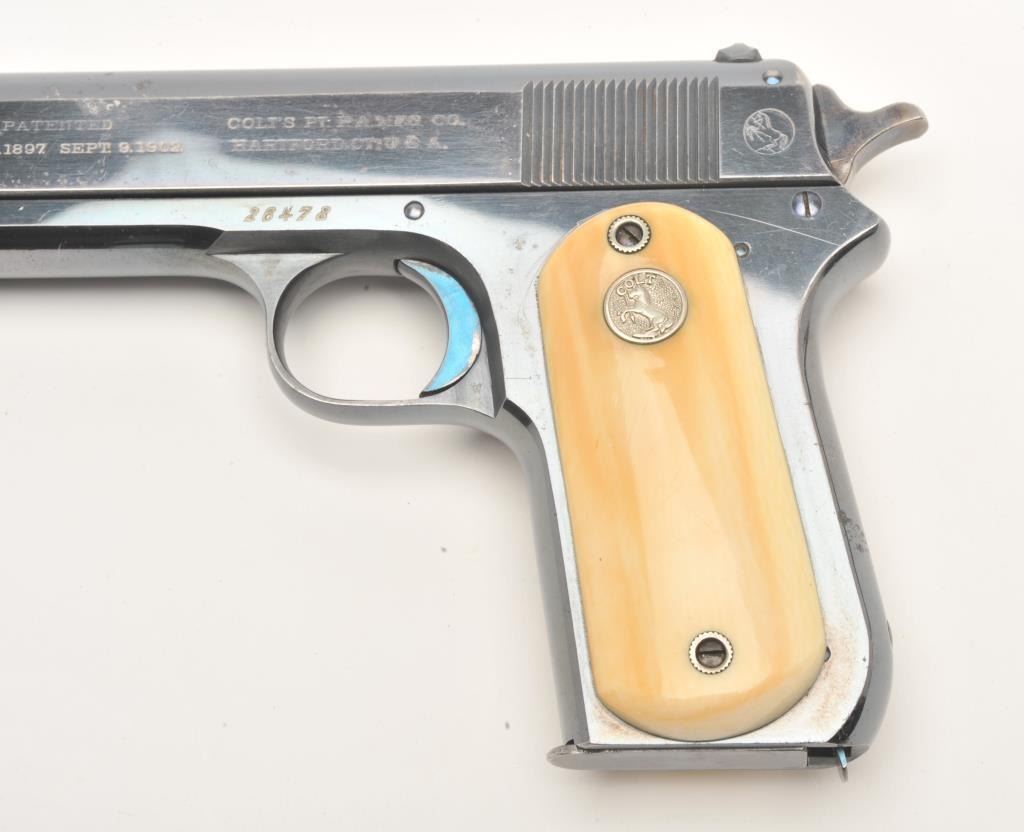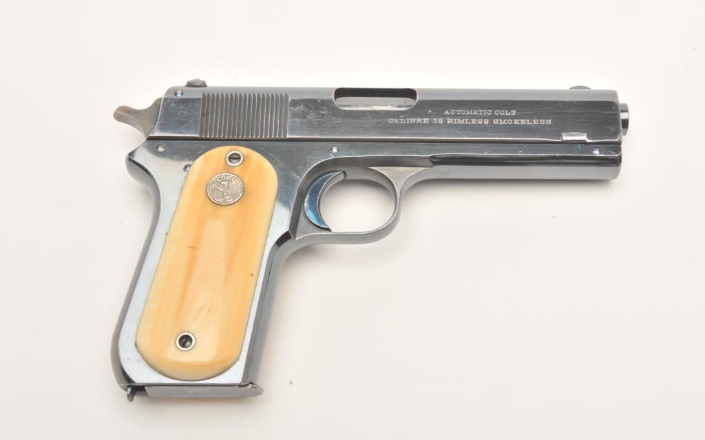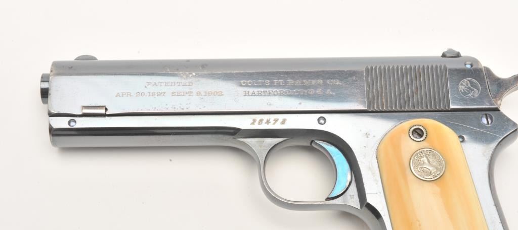 Colt Model 1903 Pocket hammer semi-automatic pistol, .38 Rimless caliber, 4.5” barrel, high polish blued finish, factory medallion ivory grips, S/N 26478, in overall fine condition showing the majority of itsoriginal high polish blue, majority of its original niter blue finish on trigger and beautiful original case colors on the hammer; crisp action, sharp markings, very good to fine bore and fine beautiful ivory grips. (C&R/PPT). Est.: $2,000-$4,000.