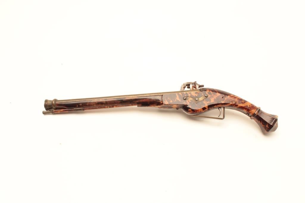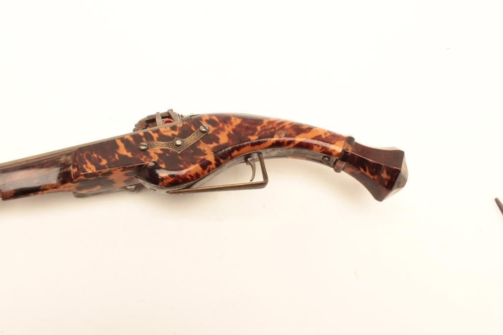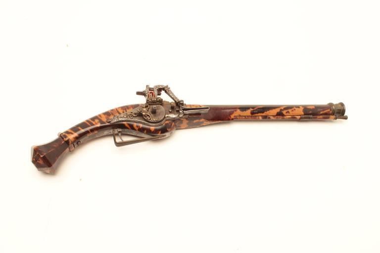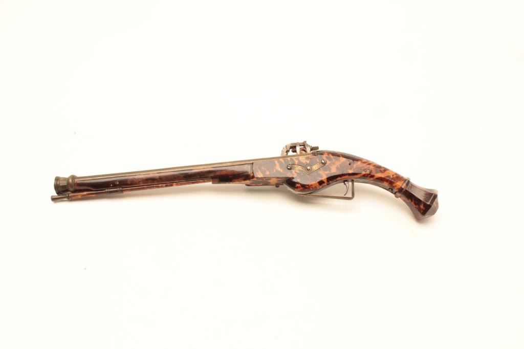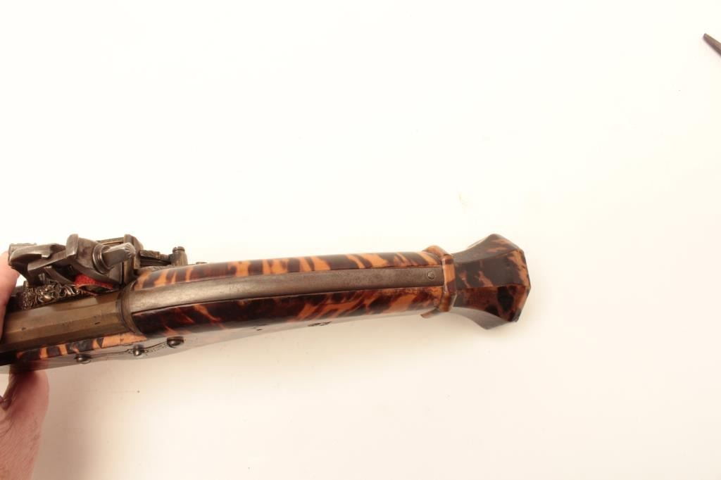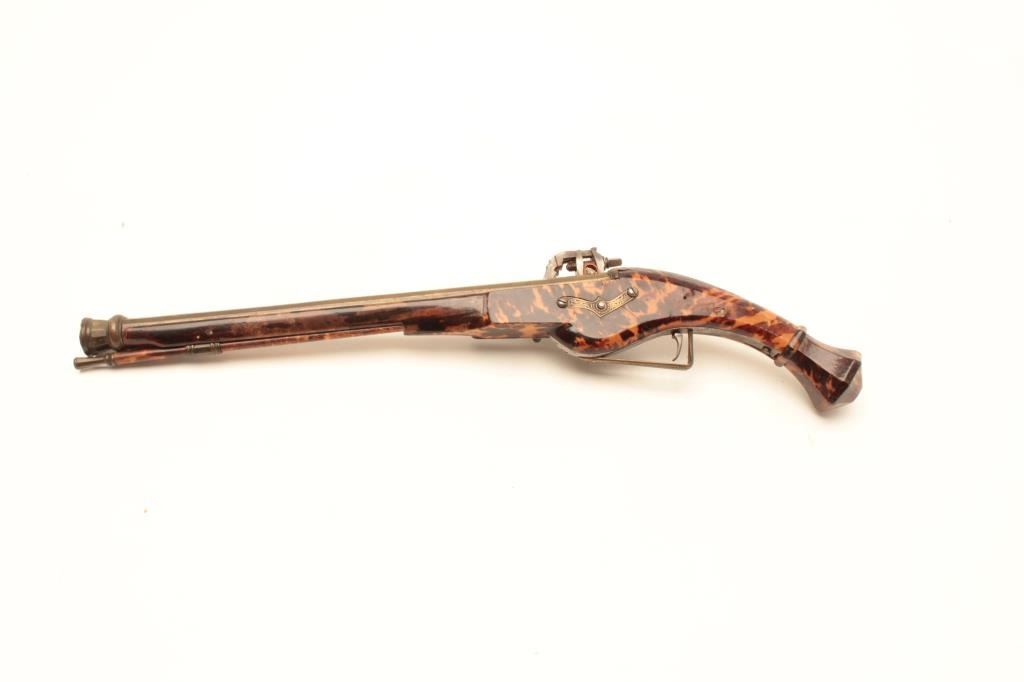 Lot 1507 French style Wheelock pistol with ornate mountings and stocking. Measures 23” overall with a 14 1/