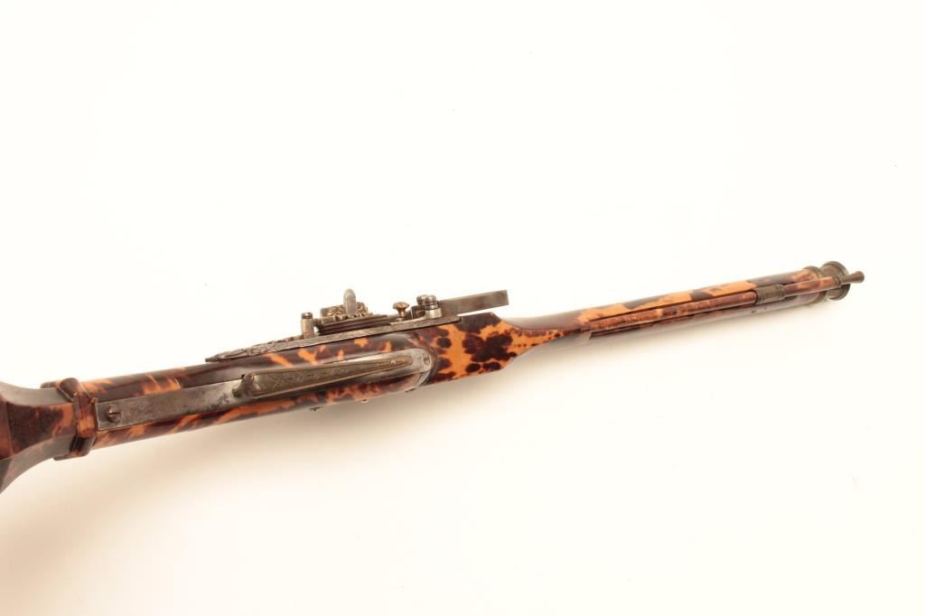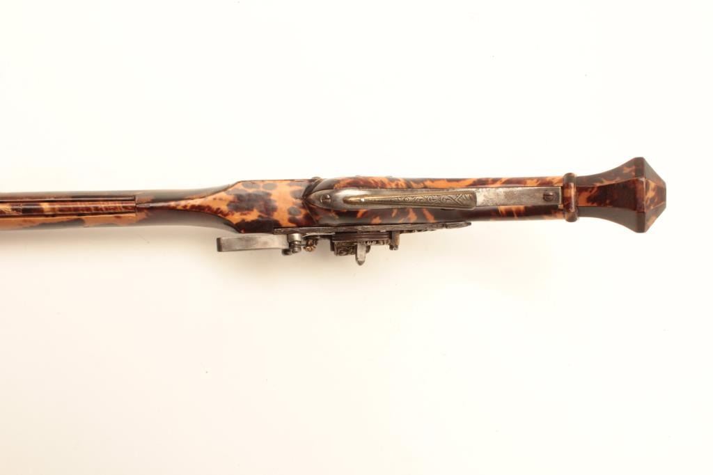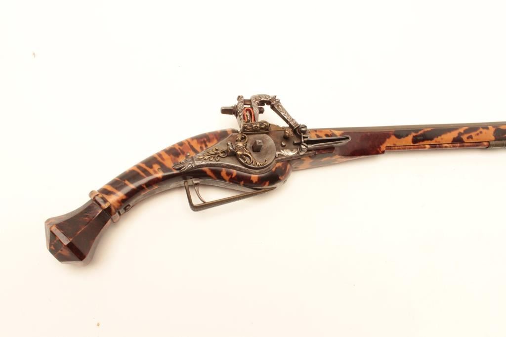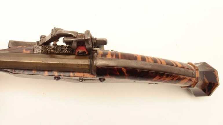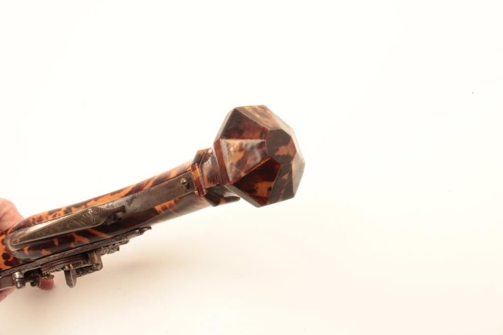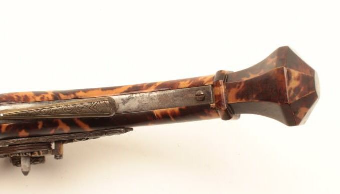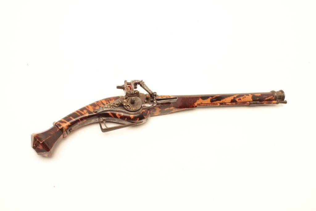 Lot 1507 French style Wheelock pistol with ornate mountings and stocking. Measures 23” overall with a 14 1/