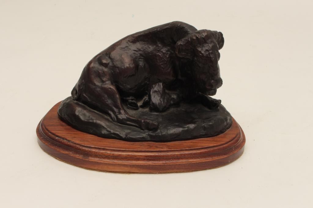 Posthumous bronze casting of buffalo by Dick Jones of Great Fall, MT. entitled “Lone Buffalo” by C.M. Russell. Jones had a frame shop and traded with C.M. Russell; Certificate #9 of 110; created off theplaster from the Russell estate; approximately 8.5” x 5 x 5. From the estate of Elmer E. Taylor. Est.: $1,000-$2,000.