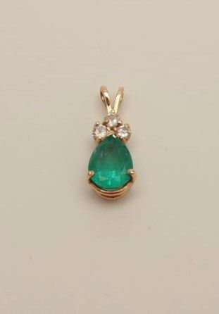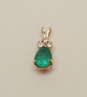 Approximately 1.25-1.5ct Pear Shape Natural Bright Green Emerald mounted in 14K Yellow Gold Pendant with 3 accenting Diamonds. Above Average Color and Clarity. Retail Replacement value $3,800. Est:$1,250-2,500