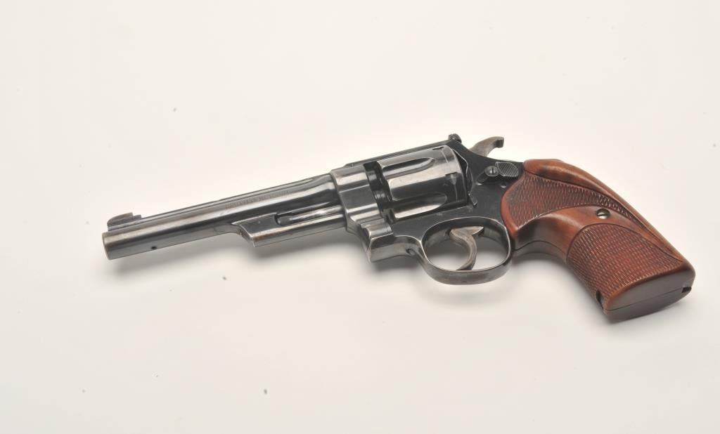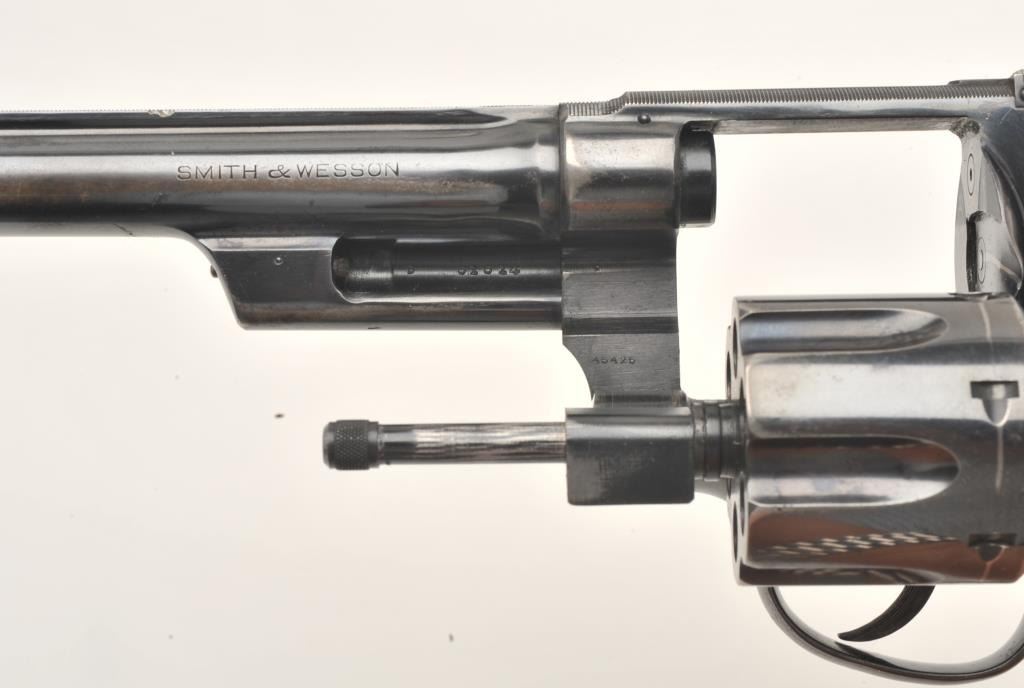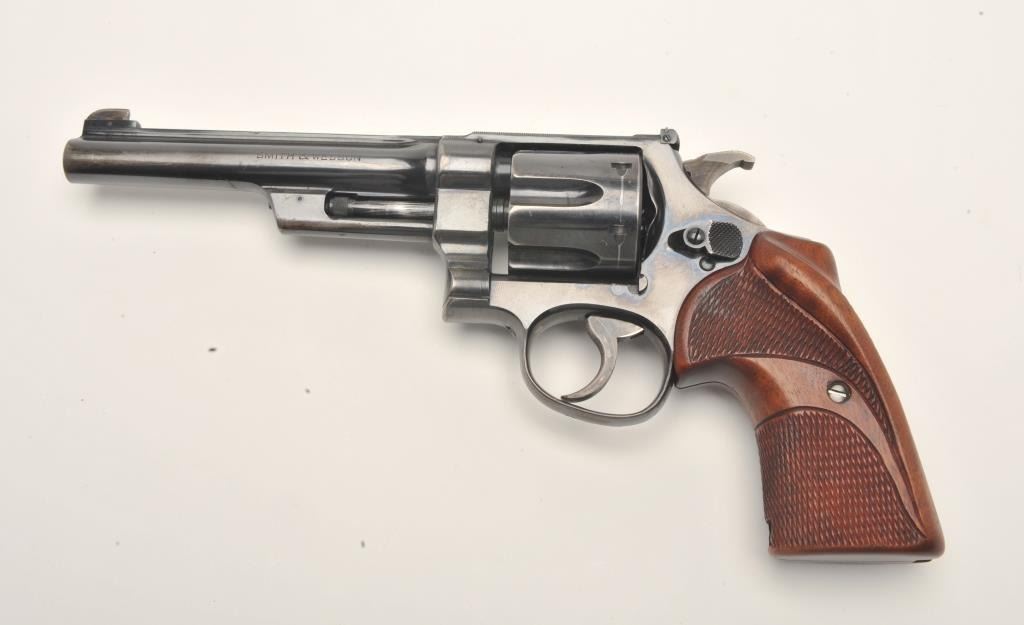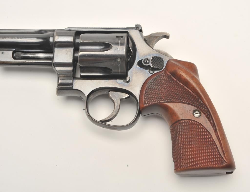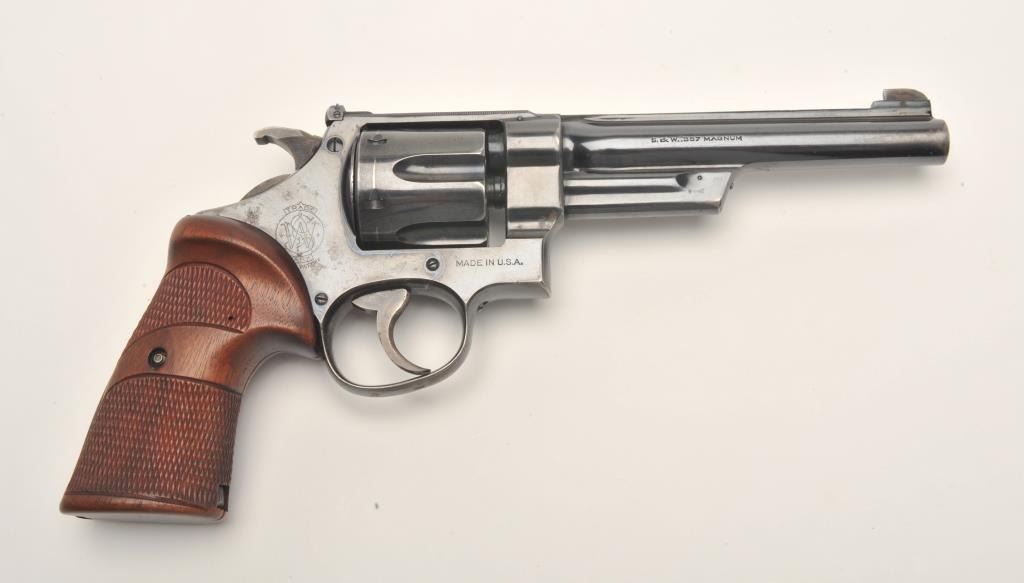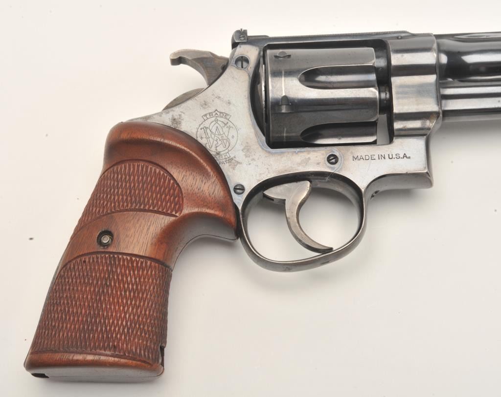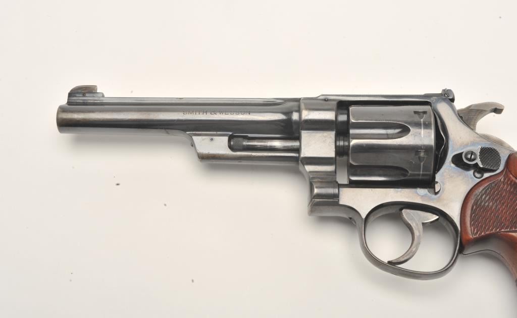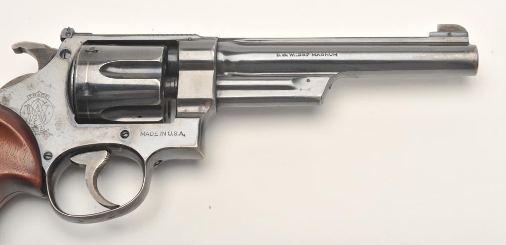Smith and Wesson Transition “Unregistered” revolver, .357 Magnum caliber, Serial #61614. The pistol is in fine overall condition with a 6” barrel with a modified front sight. The pistol retains approximately 90% of its flaking blue finish with wear along the barrel and at the rear of the frame. The pistol features muted case hardening on the Humped Back hammer and trigger. The custom checkered wood target grips are in very goodcondition showing only storage wear. The bore is very good, the action crisp and markings are sharp. The pistol includes a Smith and Wesson factory letter which confirms the features and indicates thepistol was shipped to A. M. Holter, Helena, Montana on June 27, 1940. Introduced as a custom manufactured revolver, the .357 Magnums were manufactured to the customer’s specifications and stamped in the yoke cutwith a registration number. After returning a registration card, the owner would receive a registration certificate. This process proved too costly and was discontinued after approximately 5,500 of the registered guns