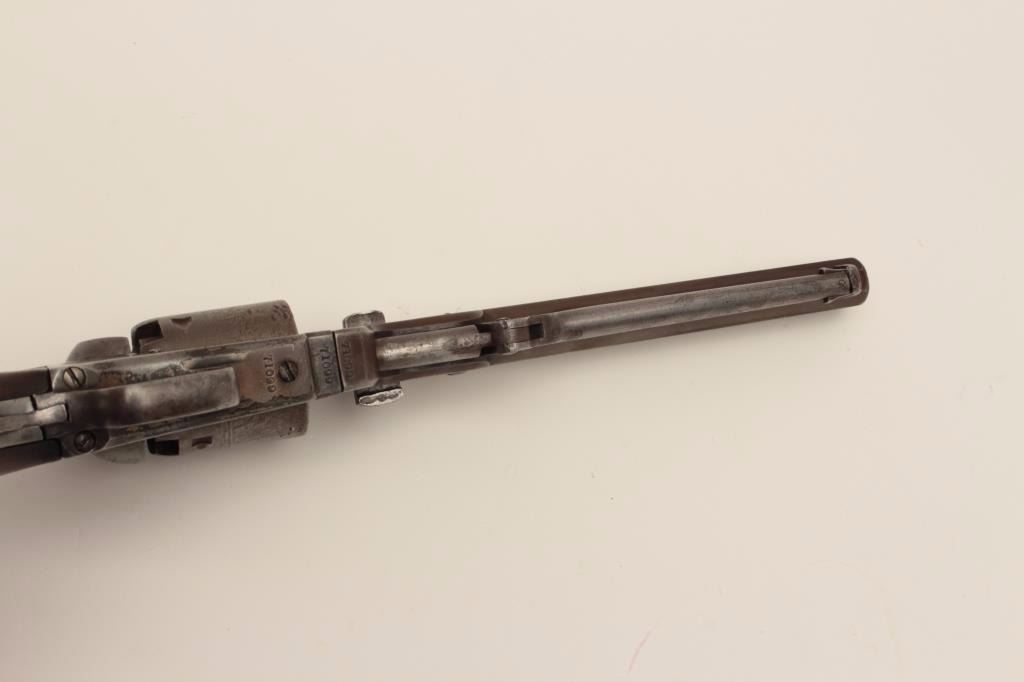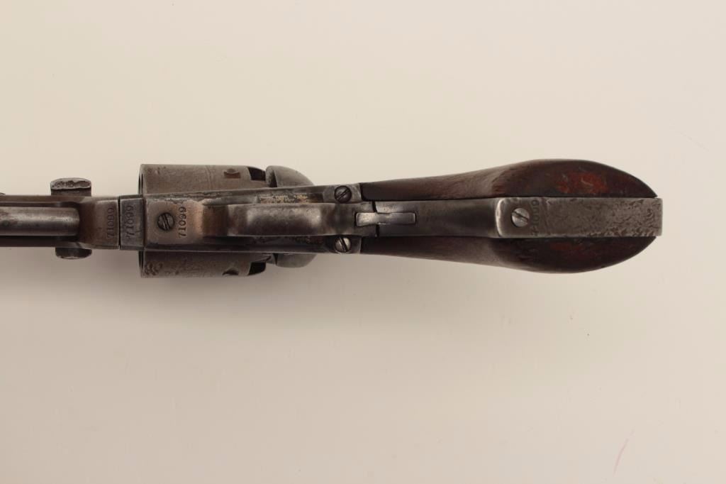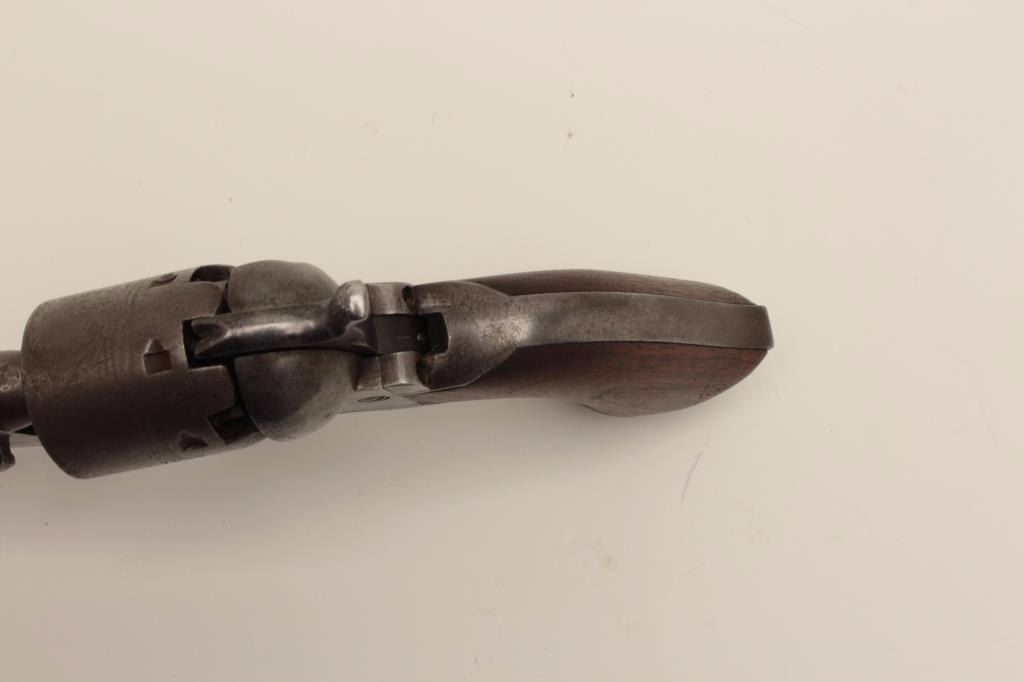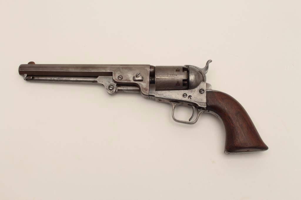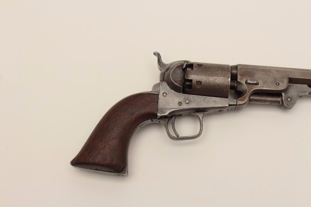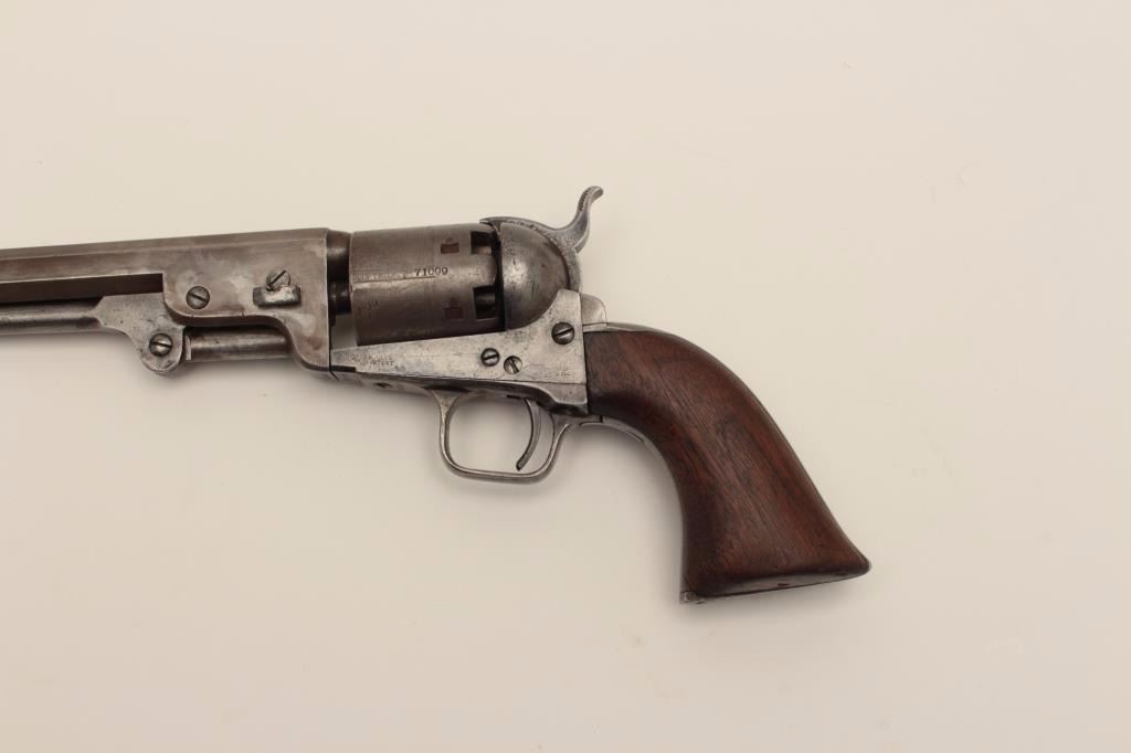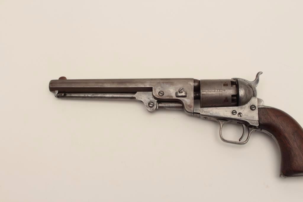 Colt 1851 Navy .36 caliber percussion revolver, S/N 71099 with iron guard and New York address. This revolver remains in good condition with cleaned gray patina finish aging back and minor coloring or browning.Good markings. The front sight has been period changed to copper post. Neat period repair to the trigger guard and back strap. The grips have been sanded slightly but still fit well with large chips to the inside ofeach “toe”. Traces of cylinder scene and all matching visible serial numbers. Strong traces of case hardening under the lever with tight action and good interior. A fairly scarce variation. (Antique) Est.: $800-$1600