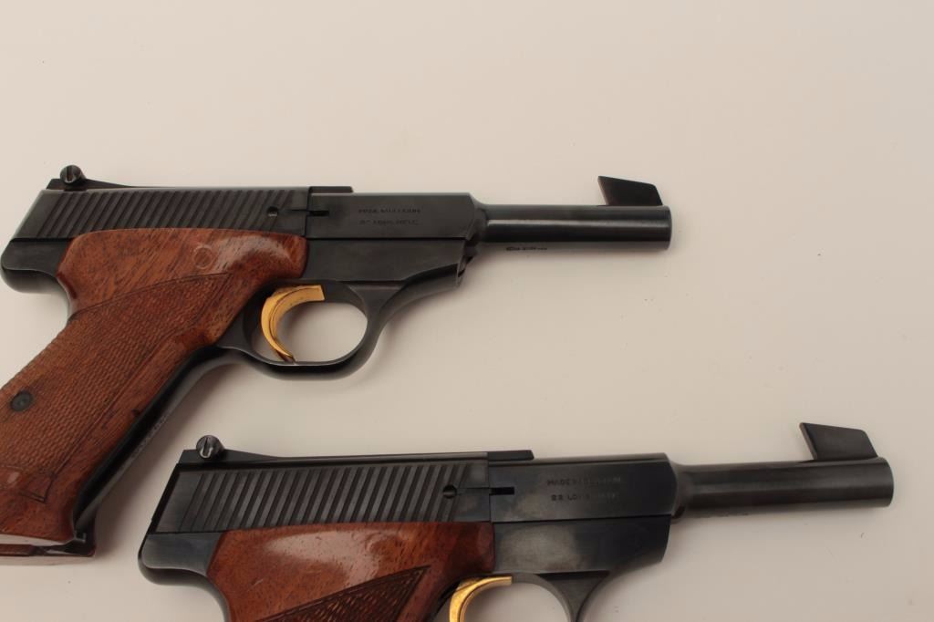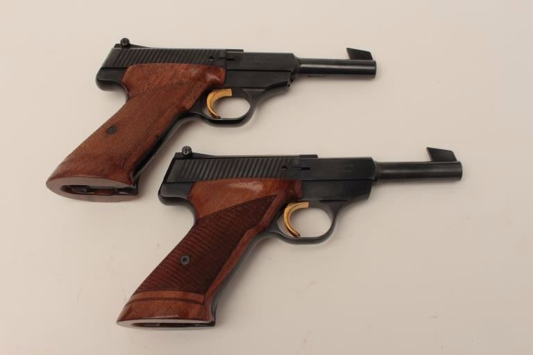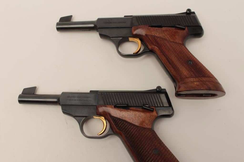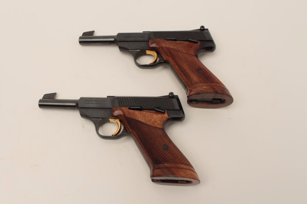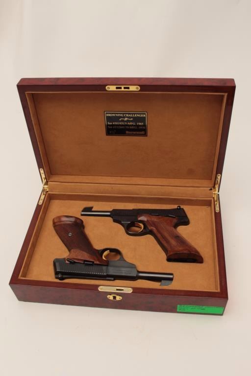 Finely custom presentation wood double cased set of 2 Browning Challenger Model semi-automatic pistols, .22LR caliber, 4.5” barrels, blued finish, checkered wood target grips, S/Ns 50192U5 & 54437U5, both guns arein near new condition. (Modern/PPT). Est.: $1,500-$3,000.