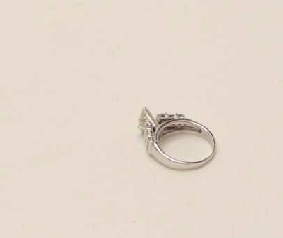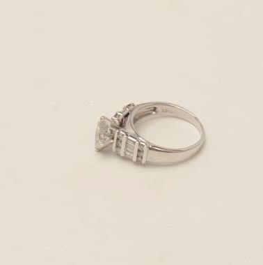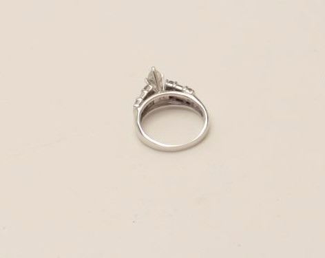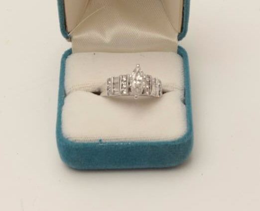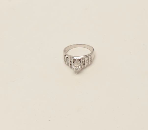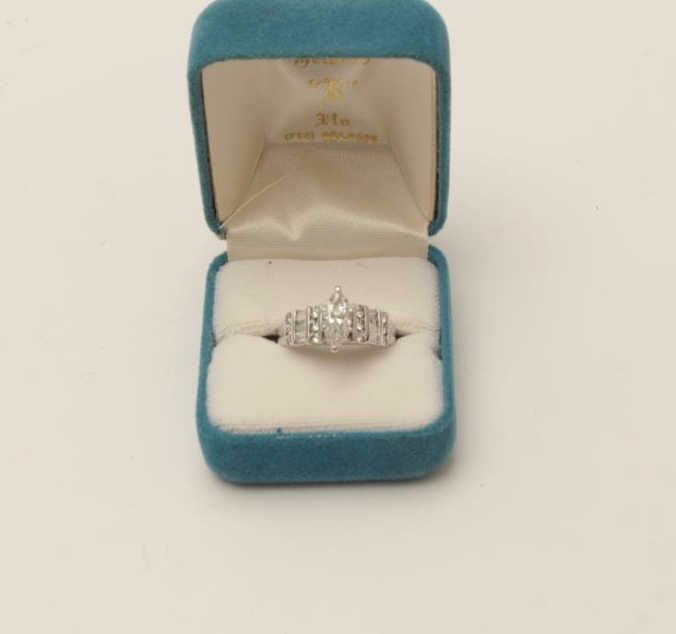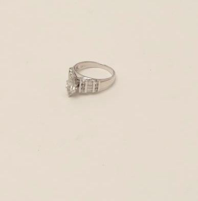 Lot 1555 One ladies marquee diamond ring set with rounds and baguettes side,in 14k white gold. Center marqu