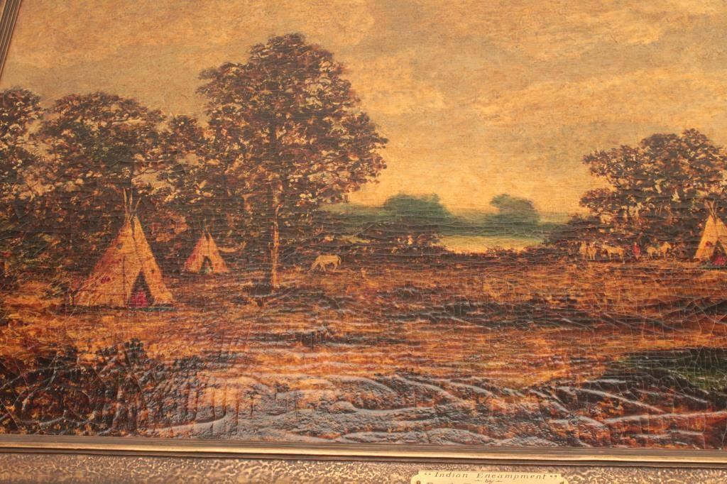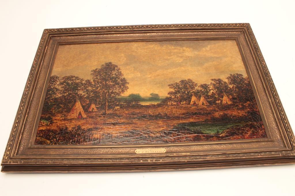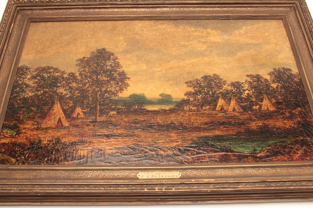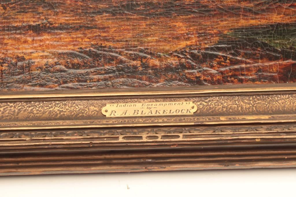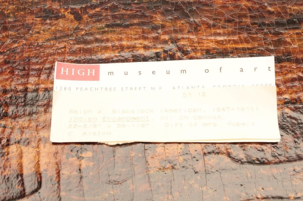 Oil on canvas signed Blakelock and titled “Indian Encampment” Measures 22 3/8” x 36 1/8”. This artist was highly copied in his lifetime. Black lights well in regards to signature. Has real age and cracking. Thispainting was displayed at High Museum of Art in Atlanta, GA. Not authenticated and sold as is. Came from a fine Palm Springs collector. Est.: $2500-$5000+++
