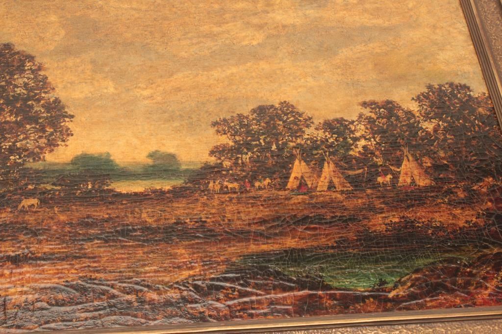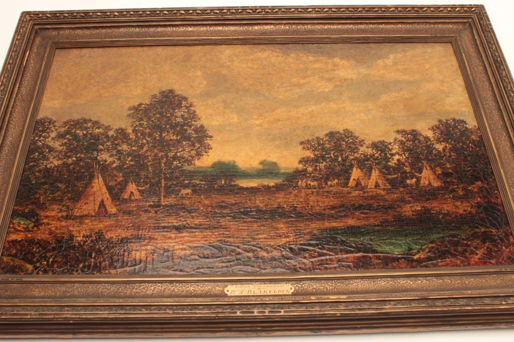 Lot 1566 Oil on canvas signed Blakelock and titled “Indian Encampment” Measures 22 3/8” x 36 1/8”. This art