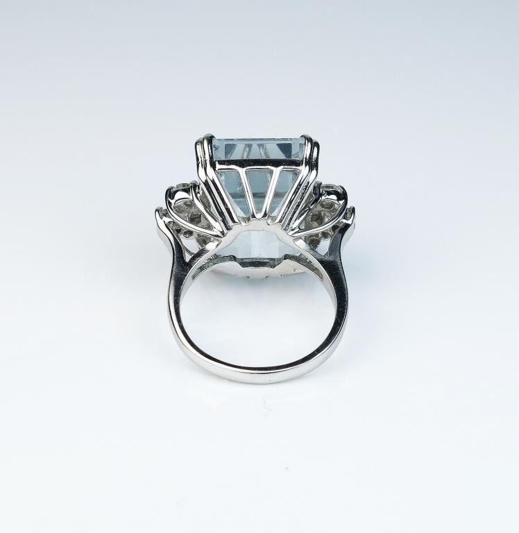 Estate ladies ring featuring a large Aquamarine weighing approx. 20.00 carats and six round diamonds weighing approx. 0.60 carats of G-H colors and SI clarity set in a 14 karat white gold handmade setting. Retail$6,000-$8,000 Estimates $3,000-$4,000