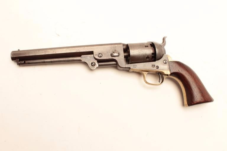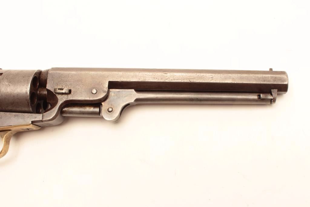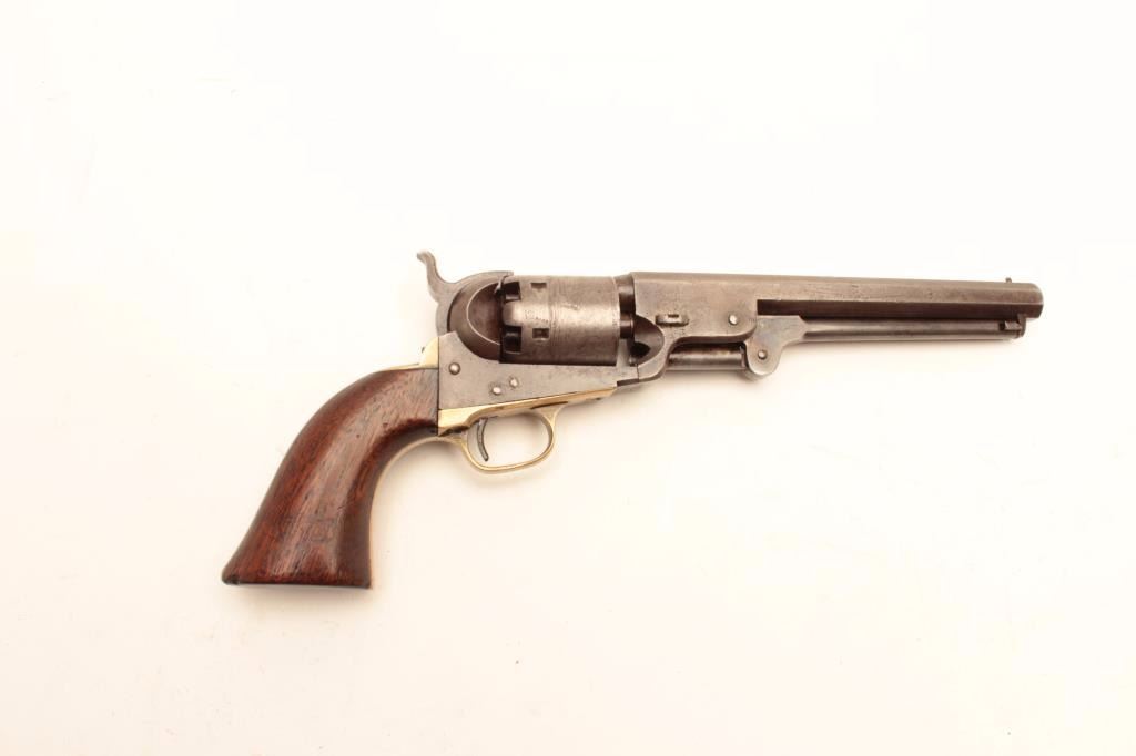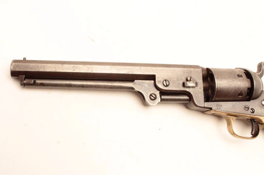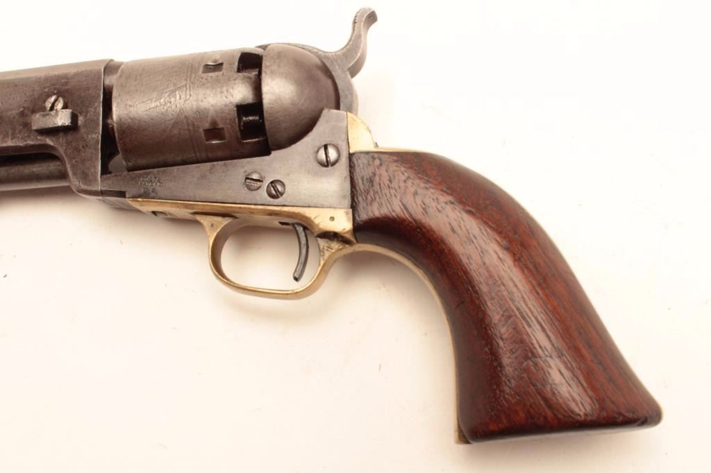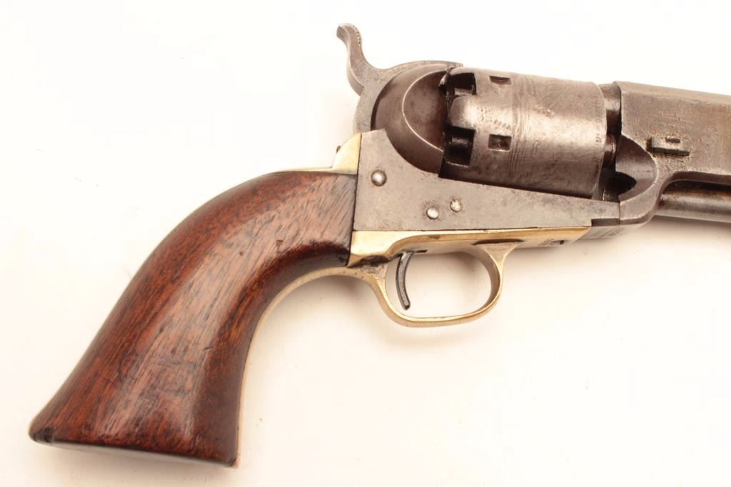 Colt 1851 Navy revolver 3rd Model martially marked and inspected for Army use, S/N 62623. This revolver remains in good to very good condition with traces of blue and case colors mixed into a patina finish. Some scratchesand minor pinprick pitting but generally very good metal surfaces overall. Sharp address and frame markings. 30%-50% cylinder scene remaining. The straps show “K” and “S” inspection with “A” on backstrap. Outlinesand shadows of cartouches on both grips. The grips are very good overall with only minor imperfections. All matching visible serial numbers. A strong 7 on a 1-10 scale. (Antique) Est.: $2000-$4000