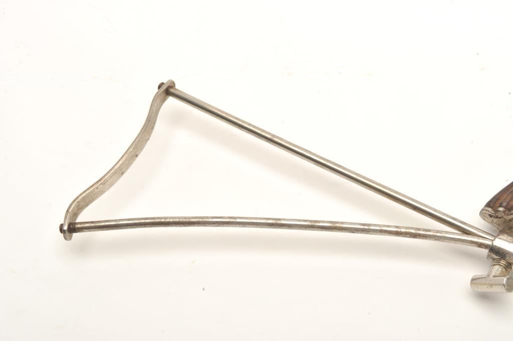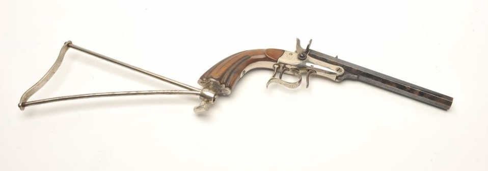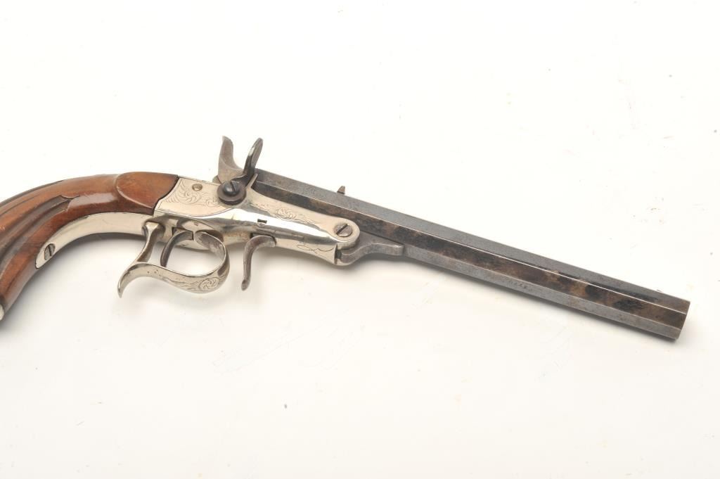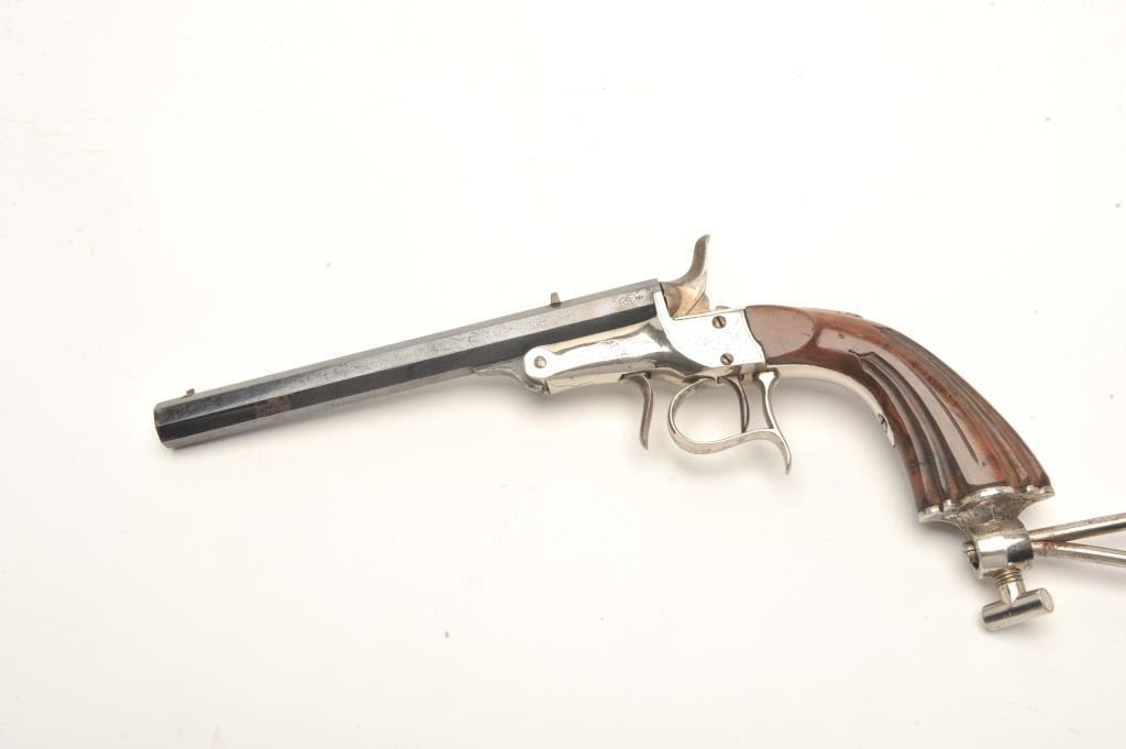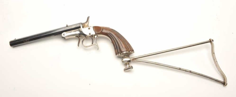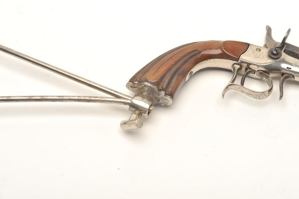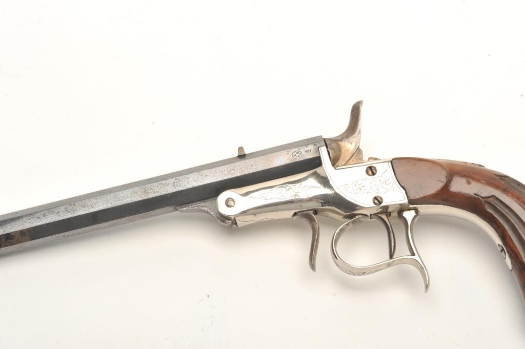 Belgium proofed Flobert style .22 caliber single shot target pistol with tip up barrel and removable shoulder stock. 80%-90% original blue on the barrel with some spotting and losses. Nickeled frame andmounts about 90% with minor rust and erosion. Very good overall. (Antique) Est.: $800-1600